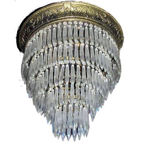 This art deco period chandelier in neoclassical empire style features five levels of cascading crystals. 200 total crystals with none missing. Lamp is wired for immediate use. Measures roughly 18" wide and 20" high. This item resides on the upper east side of Manhattan in New York city, and may be seen in person by appointment. Thanks for visiting. Please let us know if you have any questions or comments.