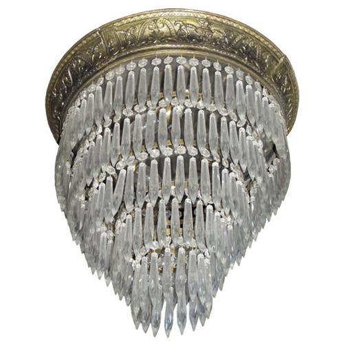 This art deco period chandelier in neoclassical empire style features five levels of cascading crystals. 200 total crystals with none missing. Lamp is wired for immediate use. Measures roughly 18" wide and 20" high. This item resides on the upper east side of Manhattan in New York city, and may be seen in person by appointment. Thanks for visiting. Please let us know if you have any questions or comments.