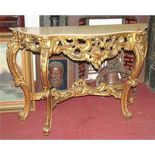 Great French console table, hand carved in wood during the Second Empire circa 1880, gold leaves gilding ( retouched), Original marble top in good conditions. Standing 48 inches wide, 33 inches H and 15 inches D .