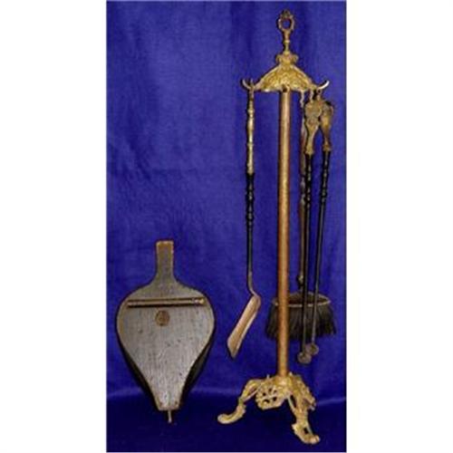 In high relief dore bronze includes the tongs, brush , ash scoop, stand and wood and leather bellows. <P>SIZE: 34 7/8 inches height (stand). <BR>CONDITION: Normal wear, overall very good.