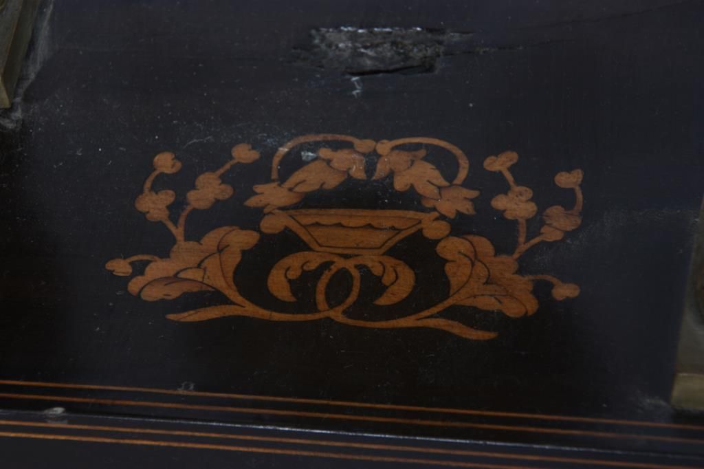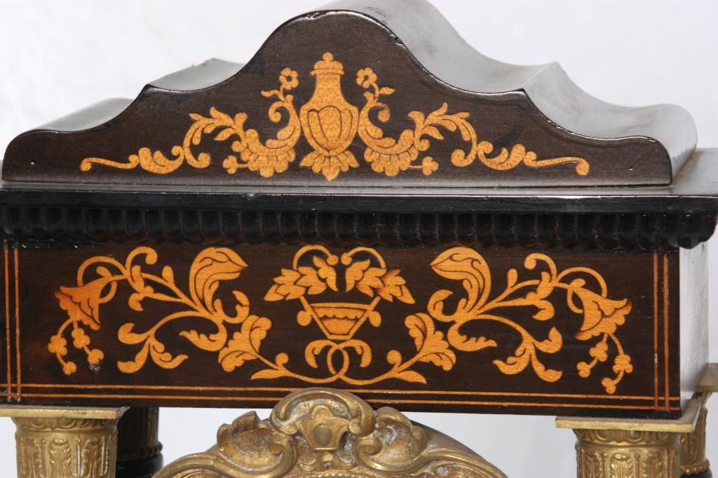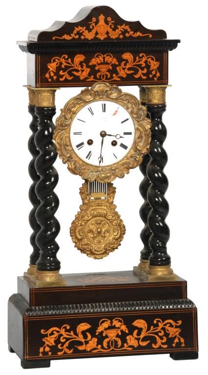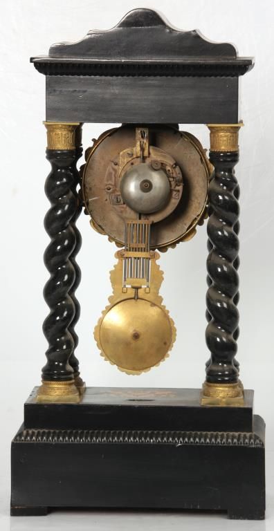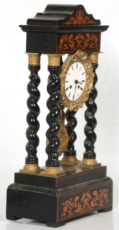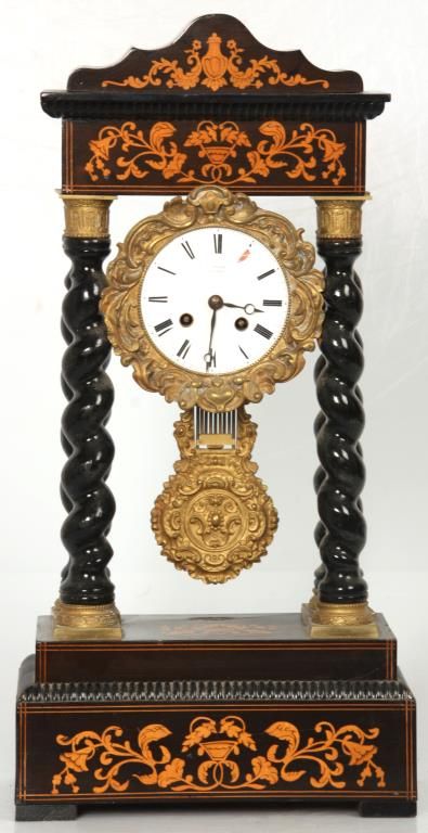French Empire Inlaid Portico Clock. 4 in. porcelain dial has black Roman hour numerals, open moon hands and signed J. Valery, a Paris; typical round French brass 8 day spring driven movement with bell strike and gridiron pendulum with filigree decorated gilt bronze bob. The inlaid walnut case has a dark brown finish with serpentine crest, 4 spiral turned columns having gilt bronze capitols & bezel and the base. Dial has some damage at 1 o’clock and the clock’s suspension spring is missing. 21 in. high x 10.5 in. wide x 6 in. deep.