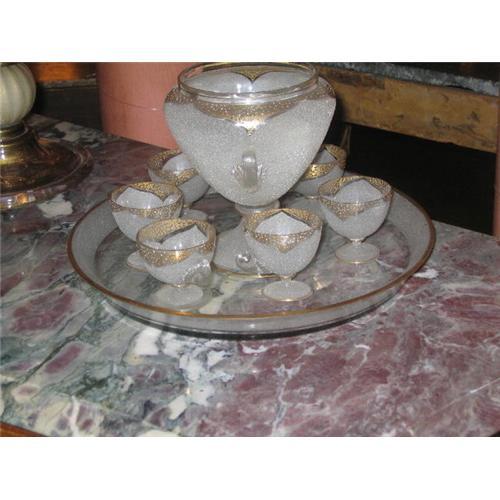 French Empire period kirsch set, in etched glass with gold-leafed trim. Set includes 6 cups with cherry bowl, c. 1805.