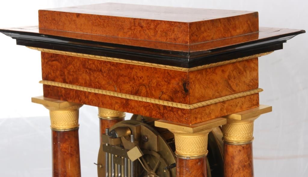 French Empire Pinwheel Portico Clock. A fantastic birds-eye maple case with 4 turned columns, bronze dore capitols, trim and bezel around the dial, which has a 5 in. porcelain chapter ring with black Roman hour numerals, engraved dore bronze center, open moon hands and sweep seconds hand. Large, round brass movement is signed Rieussec, Hger Du Roi; has a pinwheel escapement, long heavy brass, gridiron pendulum hangs from a knifepoint suspension in the rear of the case. 22.25 in. high x 11.25 in. wide x 6.75 in. deep.