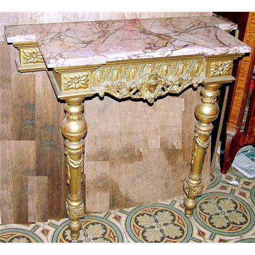 Beautiful period piece, original Napoleon III console, gilt with gold leaves, carved wood and period original marble in very good conditions, a few tiny chips and minor defects we are restoring now.