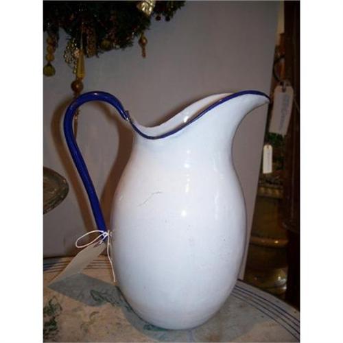 French enameled metalware pitcher, solid white with blue trim on the rim and the handle. We found this in Paris, France.