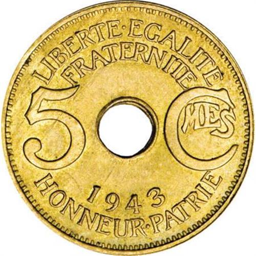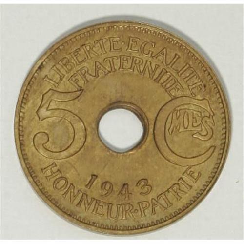 <B>French Colonial 5 Centimes 1943,</B></I> KM3, lightly toned UNC, rare type not released for circulation.<BR><I>From the Robert Sayre Collection.</B></I><BR><BR><b>Shipping:</b> Coins & Currency (<a target="_blank" href="http://www.heritageauctions.com/common/shipping.php">view shipping information</a>)
