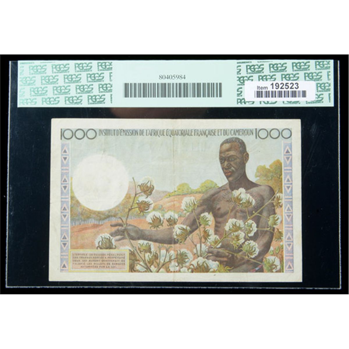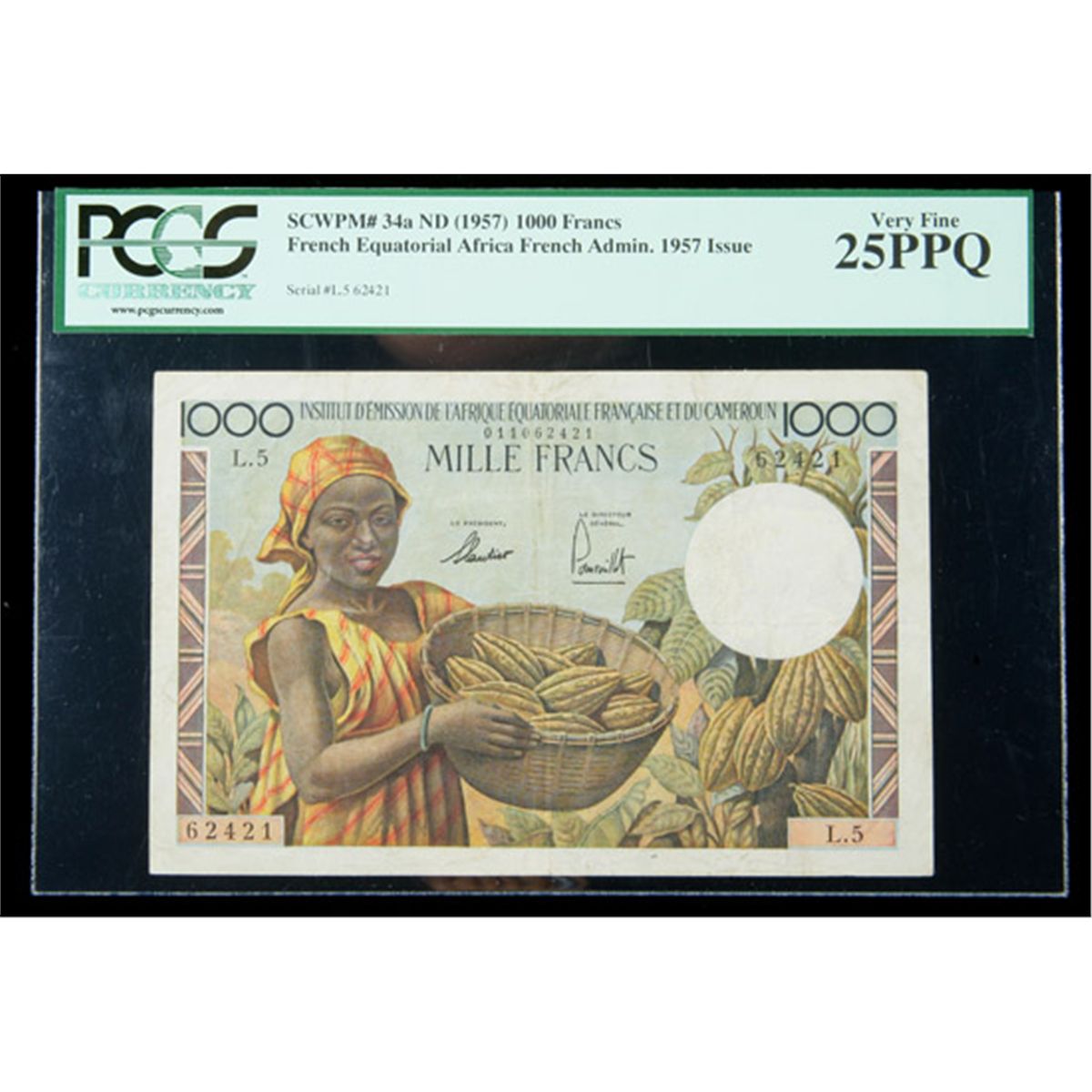 French Equatorial Africa SCWPM# 34a, ND (1957) 1000 Francs. PCGS Very Fine 25PPQ. . Fr-P-34a. Problem-free and attractive for the grade, and earning the "PPQ" designation from PCGS Currency for being "original and problem-free for the grade."