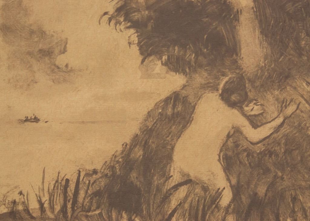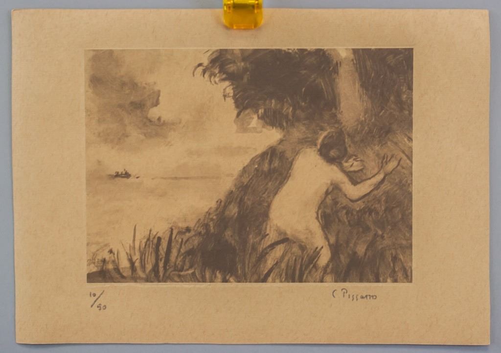 Linocut etching on paper. Featuring a landscape sccene with figure by the coast. Signed C Pissarro and inscribed 10/50 on the lower right and lower left corner, respectively. 21 x 30 cm (8.3 x 11.7 inch)