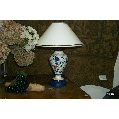 This charming French faience lamp with shade has all the colors of Provence. The white shade has cording matching the deeper blue of the lamp. This beautiful lamp could be used in any room. (We have a matching pitcher available also.)