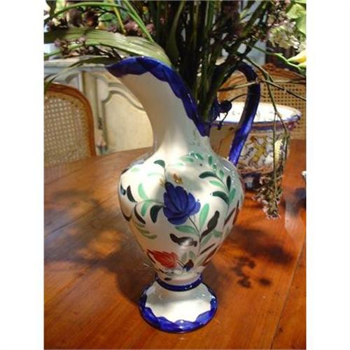 This French faience vase has all the colors of Provence-wonderful cream background with blues, greens and reds. ( Also, there is a matching lamp in our inventory) This piece which would brighten up any room. Please note there is also two small hairline cracks along the handle.