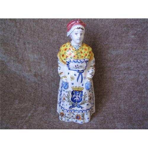 French Faience Pottery Bell in the figure of a rural peasant woman. Vibrantly painted in blue, yellow and red. The figure stands 8 1/4 inches high and has a 3 1/2 inch base.