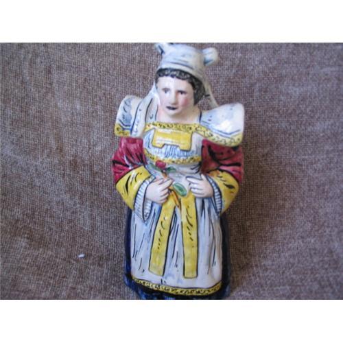 Vibrant colors of blue, yellow and red make this figure of a rural peasant woman charming. She has age crazing but otherwise no chips or cracks or restoration. Nicely painted and marked "Hand Painted Made in France".