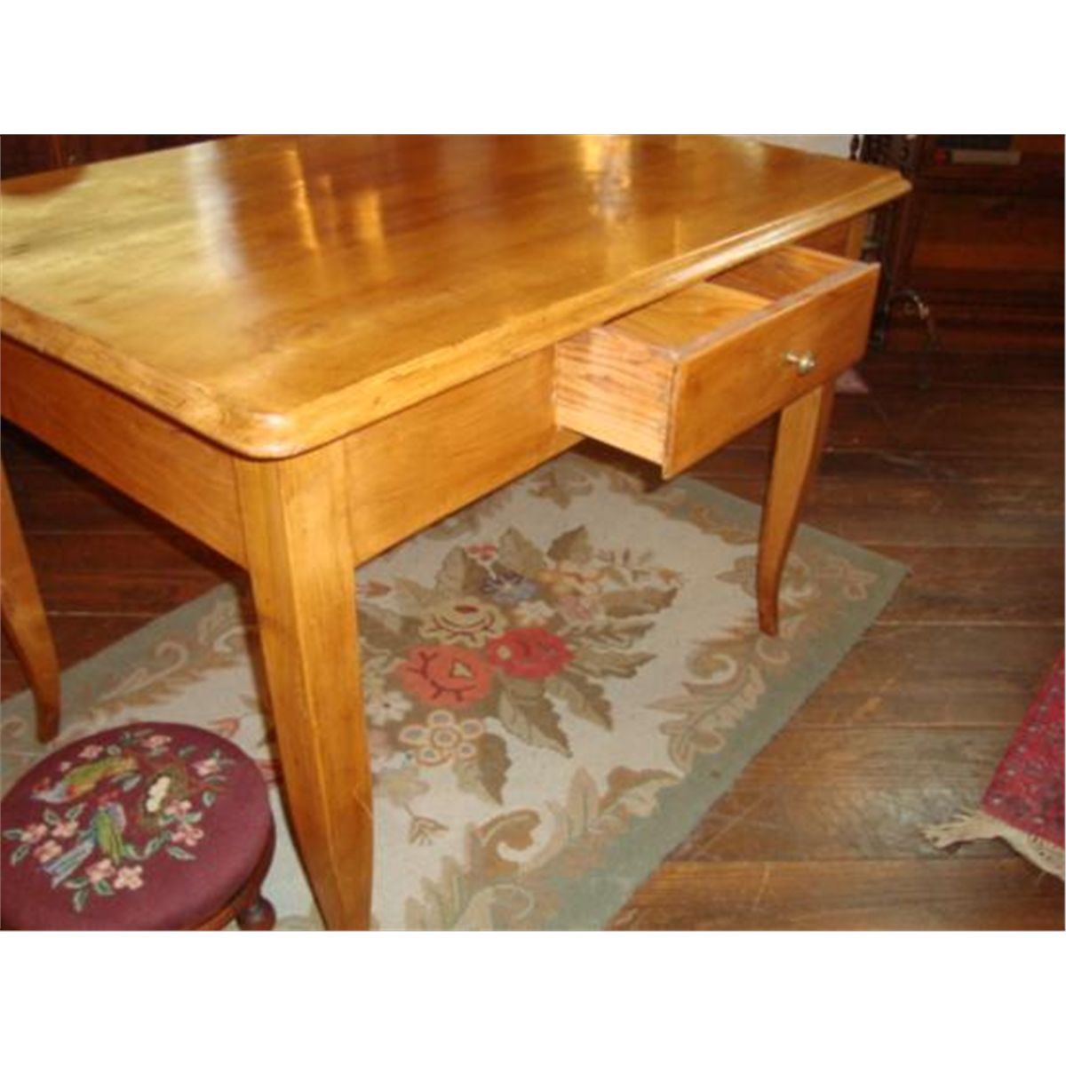 Here is a very nice French Farm table-desk with one drawer and curved legs, in very good condition (Circa 1850). This piece was made of fruitwood by a French cabinet maker from Eastern France. You can use as a TABLE or as a VERY NICE DESK! In very good condition and gorgeous patina! For the shipping...don't worry, we ship from Texas (not from France)!H-30.25/ W-42.25/ D-31.5
