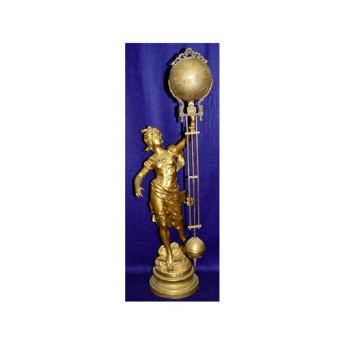 French Female Figural Swinger (Swing Arm) Mystery Clock; Spelter base marked "La Fortue Par L. et F. Moreau". SIZE: 32" h. CONDITION: Old restoration to the hand holding the cone, otherwise good working condition.