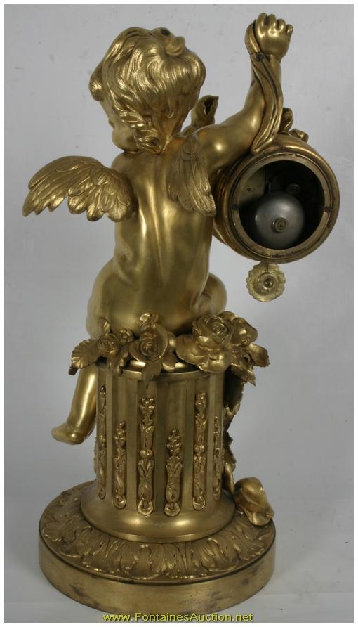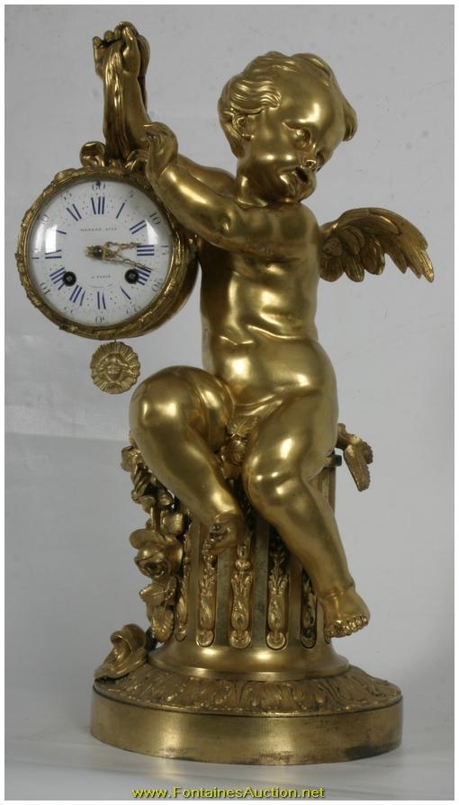 French Figural Cherub Silk Thread Mantle Clock. Figural bronze winged cherub sits atop a fluted pedestal mounted with flowers and filigree; holds up the clock movement to its right side. Gold pierced hands, enameled 3 1/2" dial with blue Roman hour numerals and Arabic 5 minute markers; typical round French brass silk thread movement, time & bell strike, gilt starburst pendulum bob; dial signed "Monbro Aine - A Paris - Jacquier". In excellent condition. 12"W x 20"H x 9"D. Estimated Value$7,000 - 10,000.