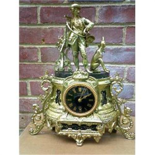 French figural gilt spelter with black slate accents depicting a hunter with his dog. The dial is black enamel with fired gold numerals and gold hands. This dial has no damage and is seldom seen in black. The works have been cleaned and are in excellent condition. Pendulum is original, key is correct replacement. Overall impressive timepiece.