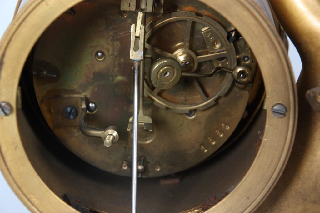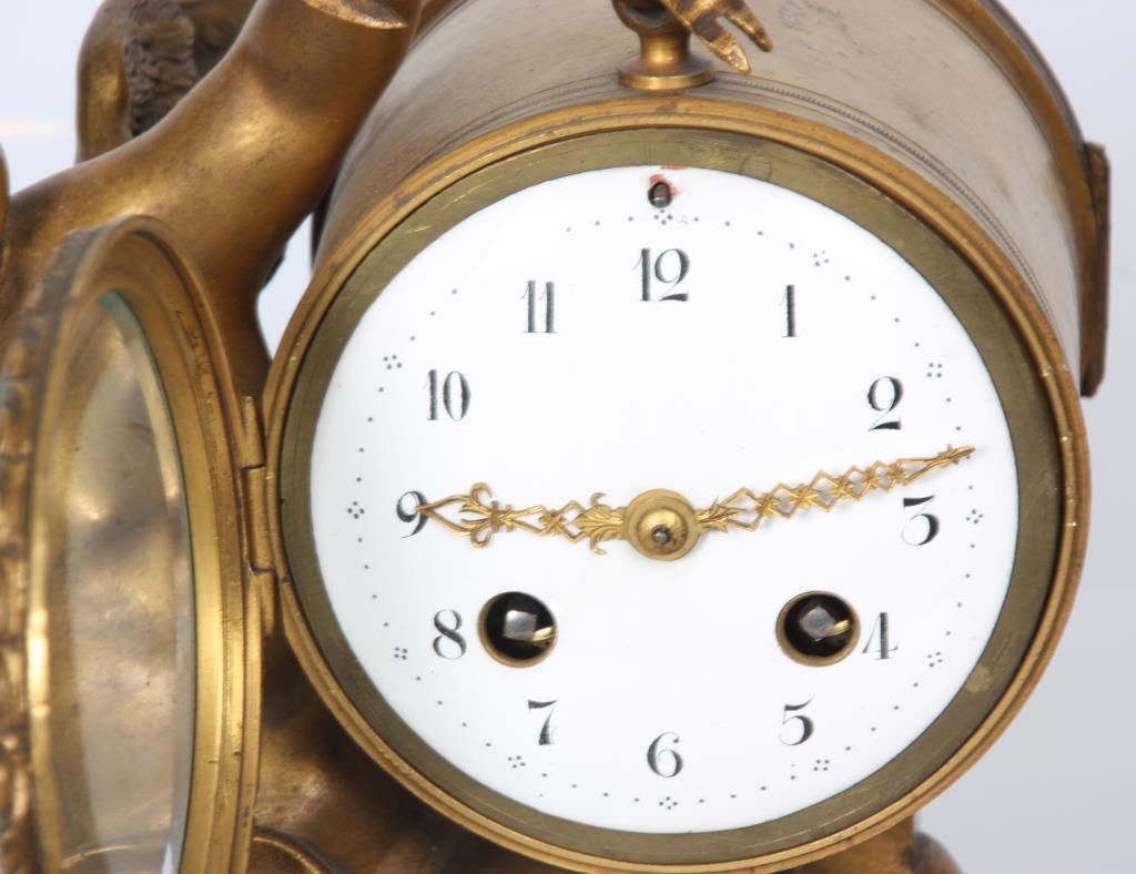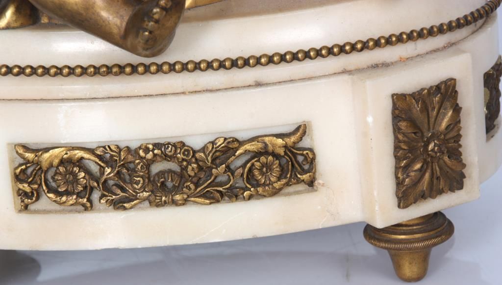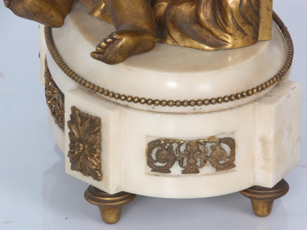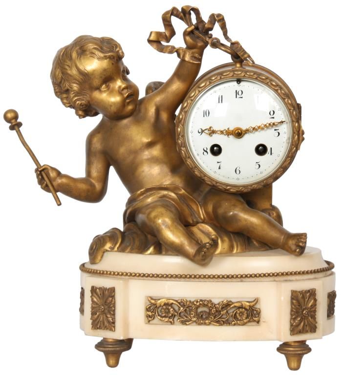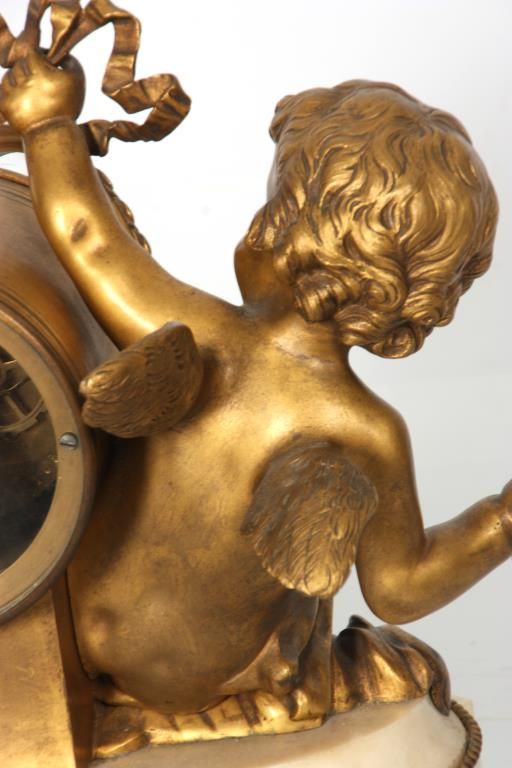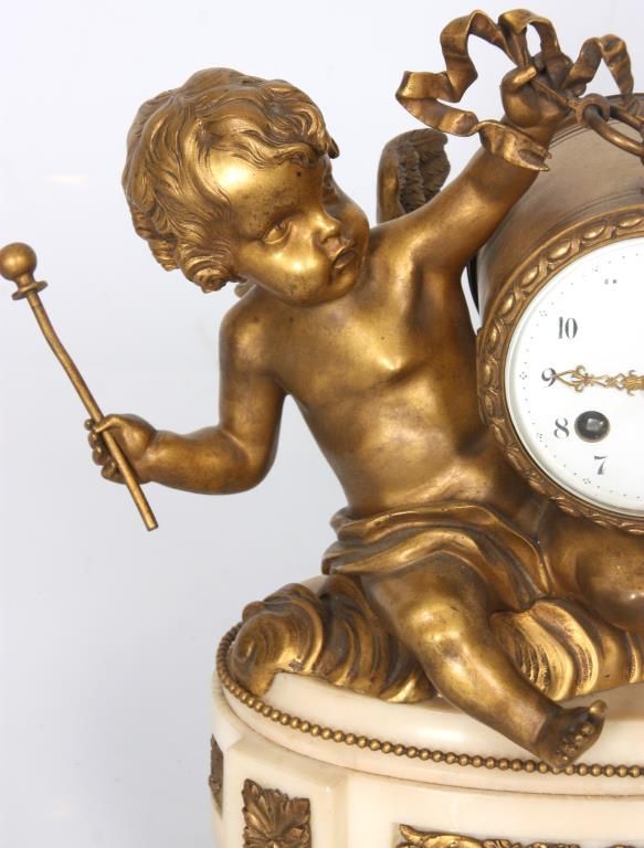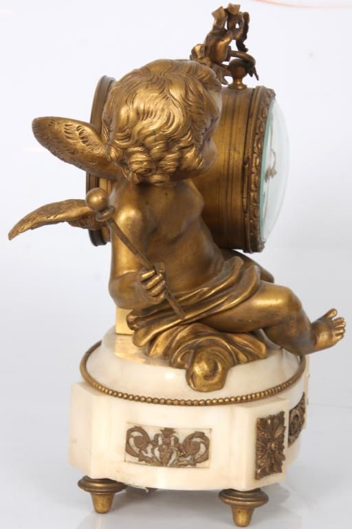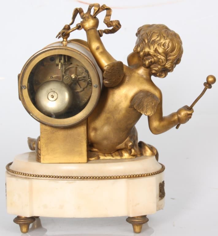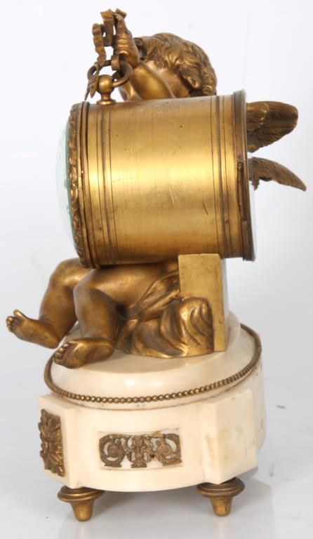 French Figural Marble & Bronze Mantle Clock. Bronze seated figure of a winged putti holding a large drum hanging from a ribbon, the drum rests on his left hip and in the right hand holds a hammer to beat the drum; has a beautiful gilt finish, on a white marble base with applied leafy filigree decorations and stands on turned feet. The dial and movement are contained in the drum, the porcelain dial measures 3.5 in. dia. With painted hour numbers and fancy gilt pierced hands; has a typical, round, brass, spring driven movement signed Samuel Marti, a half hour countwheel strike mechanism and strikes on a steel bell. 12 in. high.