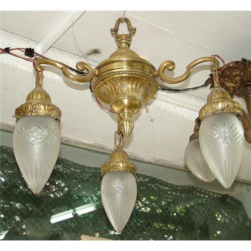 Wonderful French Foundry Bronze 3 lights Chandelier with original Acid etched shades about 1930. Restored and Rewired.