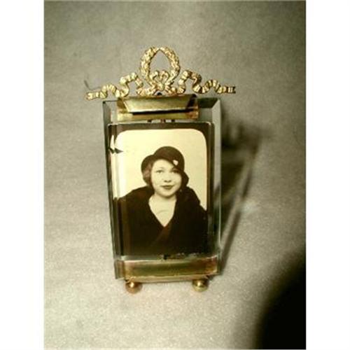 Unique petite bronze and beveled glass French frame C.1847,woman in long dress on the back with date. Bronze plates with laurel wreath and flowing ribbon,center top,solid plate below,attach to a spring mechanism on the center back. Pull up and disengages. Tiny bronze feet and easel. This style mixes easily with other antique frames,gives a clean,yet old look and allows for floating a photo if not as large as the overall dimension (see main photo). Excellent condition. Measures overall 4H X 1 7/8 L including bevel. Glass with bevel alone, 3H X 1 7/8L.