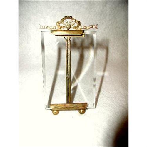 Bronze and beveled glass French frame C.1847,woman in long dress on the top back with date. Bronze plates with a tied ribbon and flowing streamers header. Tiny ball feet of bronze on bottom plate which attaches to a spring mechanism on the center back. Pull up and disengages. Style mixes easily with other antique frames giving a clean and clear appearance. Excellent condition. Measures 5.5H X 2.75L with frame. 4.5H glass with bevel X2.75L, 2.25L inside bevel,3.75 H inside bevel,X 2 D with easel.