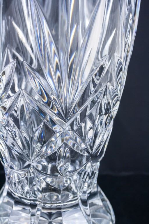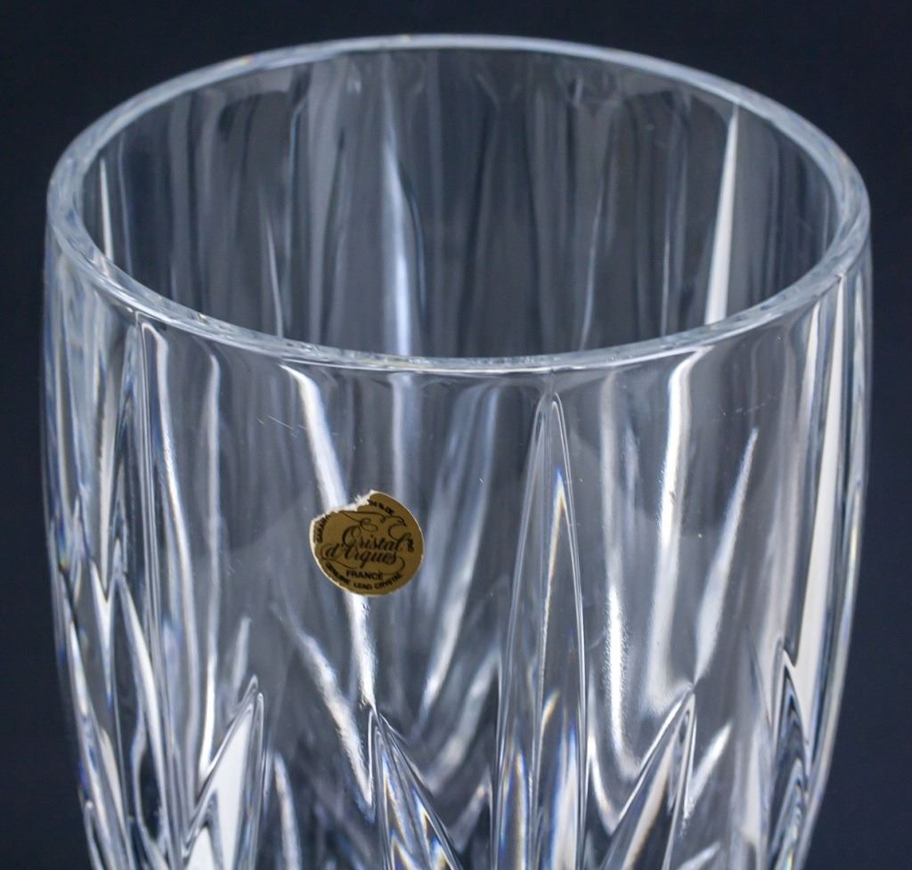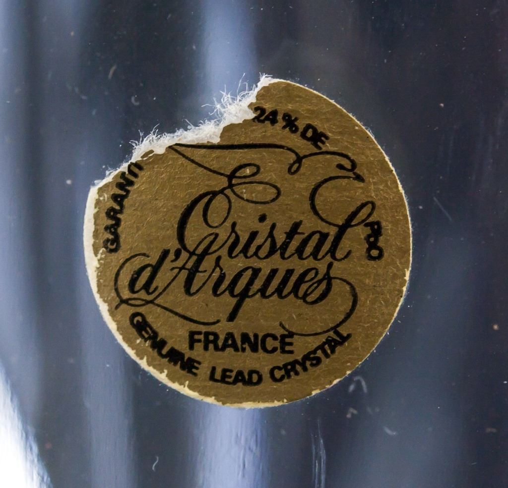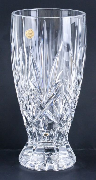 French crystal vase. With wide round opening tapering to narrow cinched base. "Cristal d' Arques / France / GENUINE LEAD CRYSTAL" sticker on vase. 30 x 14 cm. 3,410 grams.