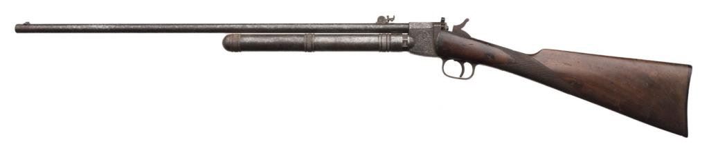 French Giffare air gun from the 19th Century, 41.5” overall with engraved frame and dark patina, S/N 12119; checkered wood stock; fair to good condition; no pump. Est.: $300-$600.
