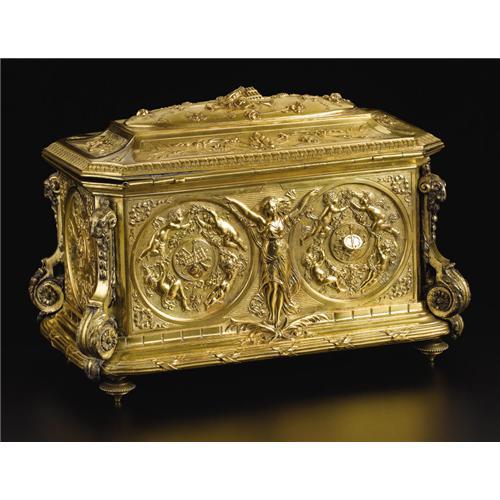 <B>A French Gilt Bronze Casket</B></I><BR><BR>Unknown maker, France<BR>Late Nineteenth/Early Twentieth Century<BR>Gilt bronze<BR>Marks: <I>AB. PARIS</B></I><BR>7 inches high x 10 inches wide x 5.88 inches deep<BR><BR>In the Renaissance-revival style, of rectangular form with canted corners; with roundals with putti and trophies emblematic of music (the front and back panels); canted corners with reverse ram head volutes; stepped top with musical trophy, raised on toupee feet; lined interior.<BR> <B>Condition Report:</B> Staining to lining, minor wear to gilding.<BR><BR><b>Shipping:</b> Requires 3rd Party Shipping (<a target="_blank" href="http://www.heritageauctions.com/common/shipping.php">view shipping information</a>)