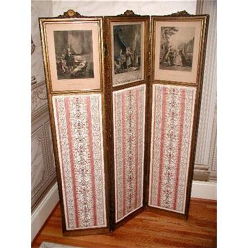 Late 18th to early 19th century gorgeous ornate gilt carved dressing screen from France has three glass covered hand colored engravings in the top portion of each panel. Title "La Soiree' D' Hyvel", "Le Coucher" and "La Promenade Du Soir",the engravers name lower right of each with the date of 1774. The bottom padded panels as well as back are covered in a rich brocade floral stripe in shades of pink,yellow gold,green,rose and off white,edged in off white gemp. The bottom back panels are recessed giving an extra design dimension due to the thickness of the glass covered engravings. This fabric has obviously been replaced in recent years as the original would have been well worn. Three different gilt carved designs on top of each framed engraving. Excellent condition. Measures 42L X 60H X 1D. Three 13.75 panels hinged with original brass hinges.