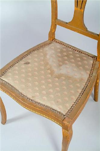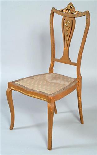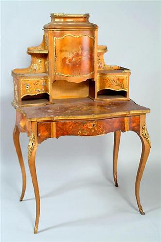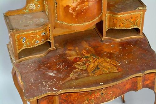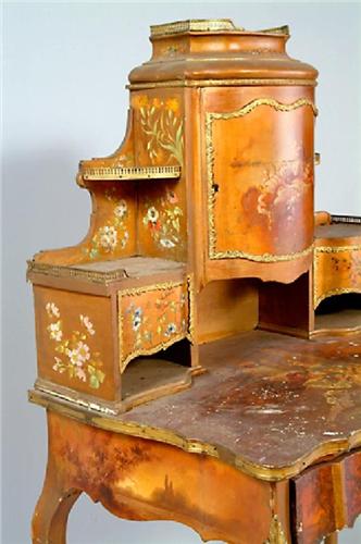 (Louis XV Style, 1890-1910) hand painted desk with ormolu fittings, wear, minor losses, fair condition, 55" by 32" by 21" Chair has olive silk upholstery, left leg loose, 37" by 17" by 17".