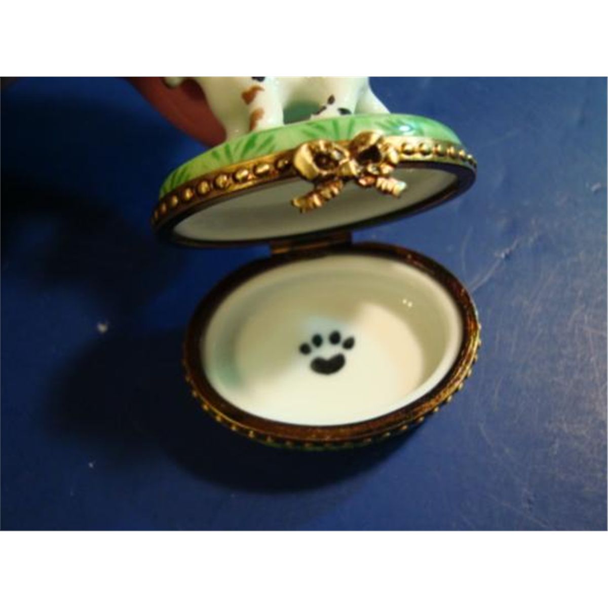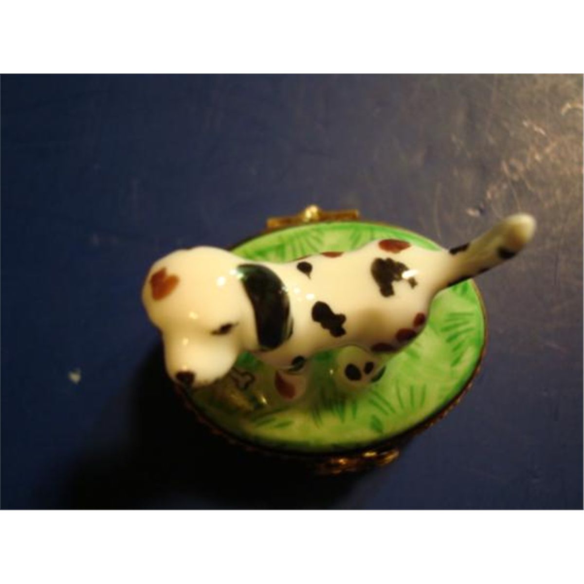 Authentic hand-painted porcelain Limoges box signed by artist from a famous studio! This Limoges box was created by an artist, graduate of one of the most prestigious French Fine Porcelain schools. Here is a SUPERB "Dog" hand-painted Porcelain box. Excellent condition, hinges and clasps work fine. This Limoges box is marked "Peint main" (Hand-painted) Limoges France, signed: G-V, as shown in picture. It is in mint condition (No chips, cracks or repairs). Would be a great value to any Limoges box collection. We ship from Texas (not from France)! h-1.75"/ w-1.5"/ d-1.25"