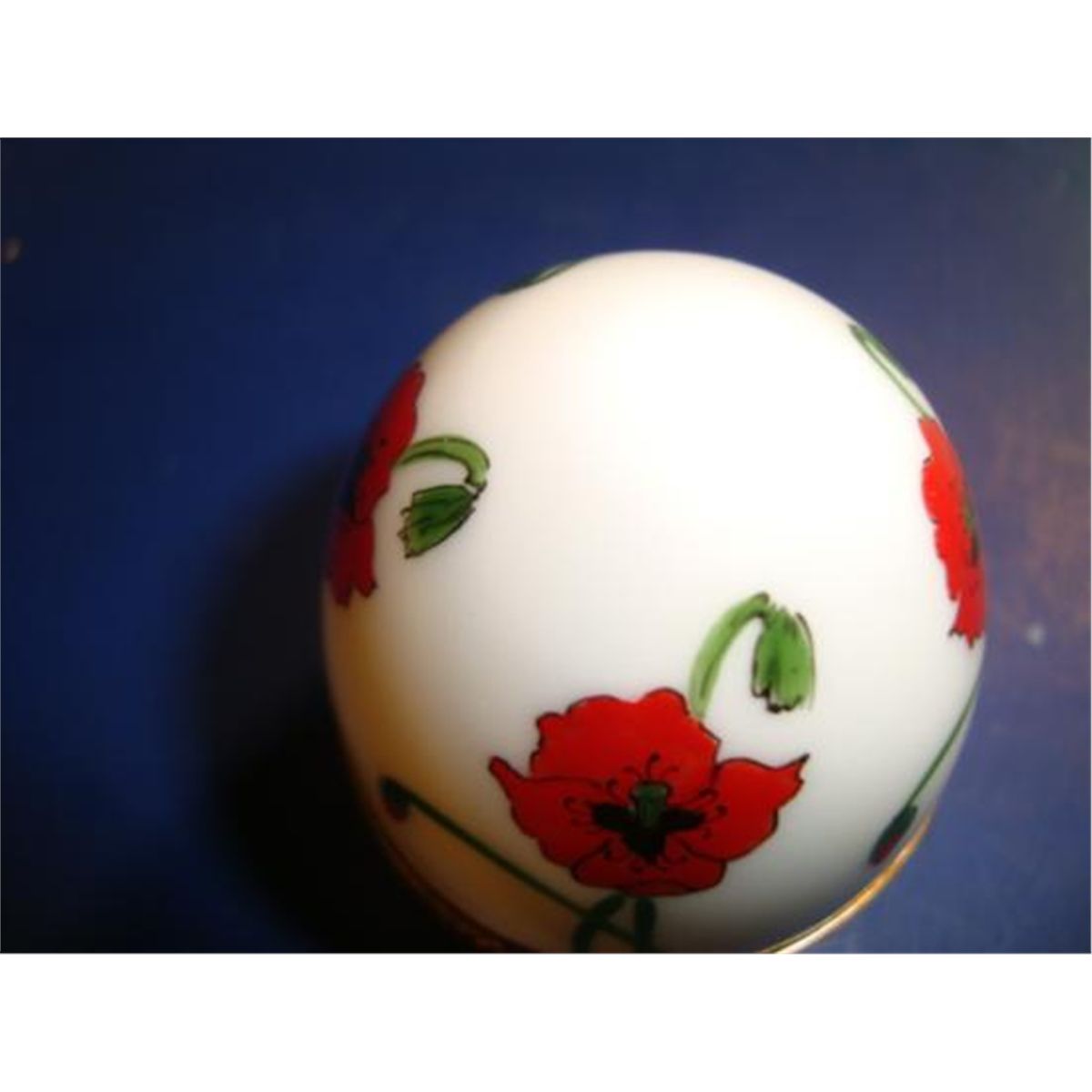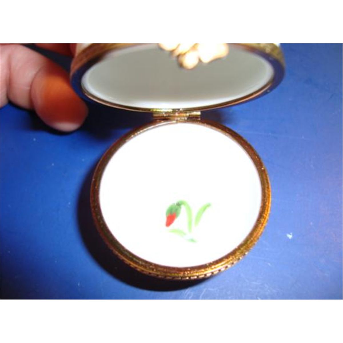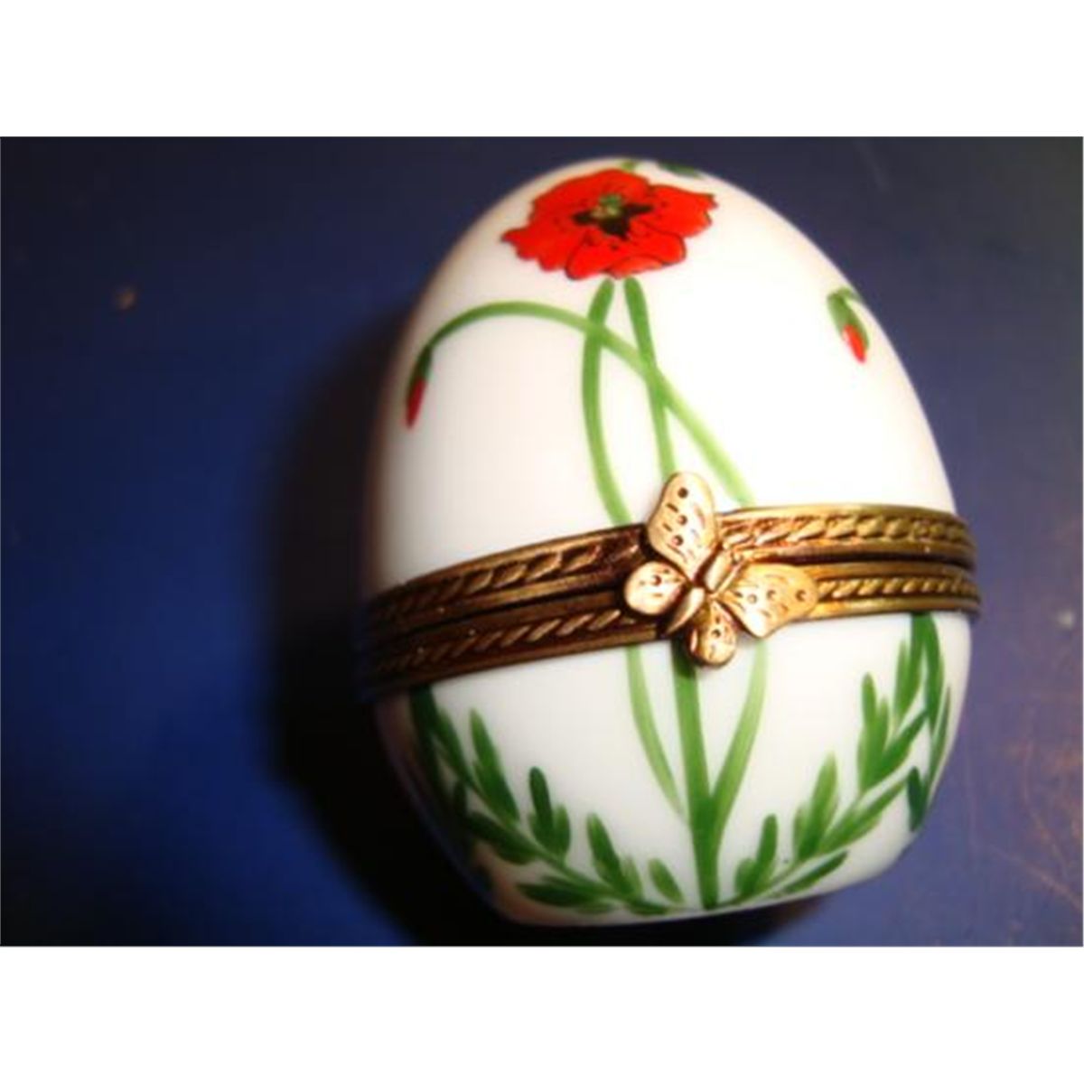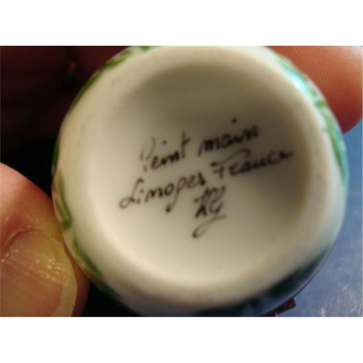 Authentic hand-painted porcelain Limoges box signed by artist from a famous studio! This Limoges box was created by an artist, graduate of one of the most prestigious French Fine Porcelain schools. Here is a SUPERB "Egg" hand-painted Porcelain box. Excellent condition, hinges and clasps work fine. This Limoges box is marked "Peint main" (Hand-painted) Limoges France, signed: R-G, as shown in picture. It is in mint condition (No chips, cracks or repairs). Would be a great value to any Limoges box collection. We ship from Texas (not from France)! h-2.25"/ w-2"/ d-2"