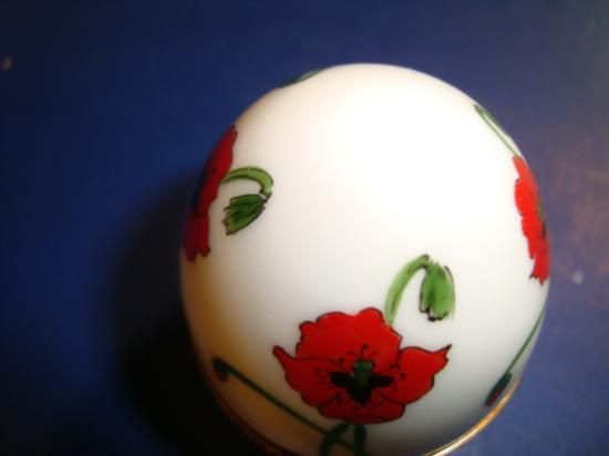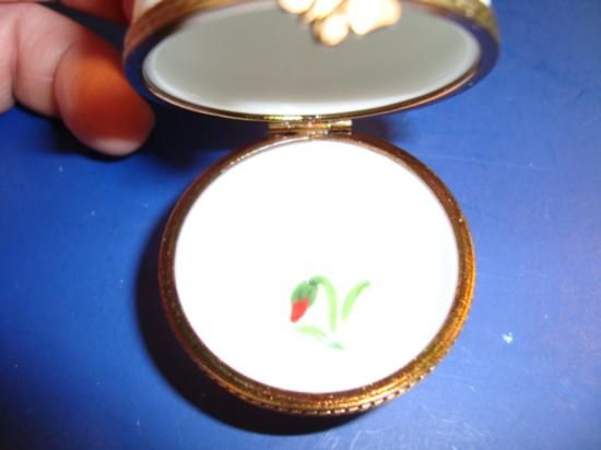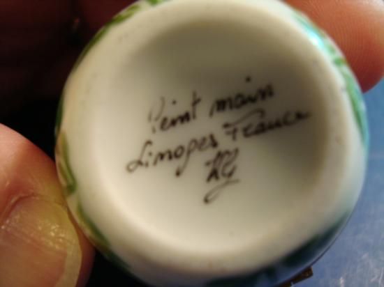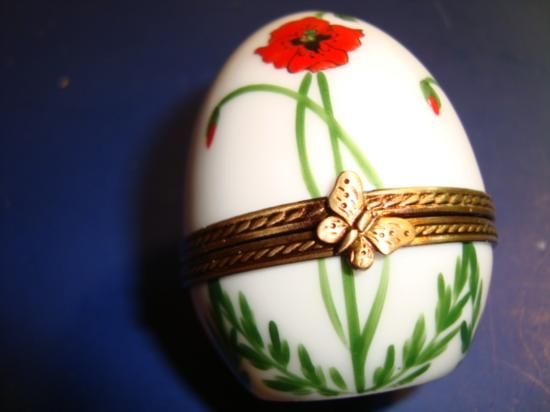 Authentic hand-painted porcelain Limoges box signed by artist from a famous studio! This Limoges box was created by an artist, graduate of one of the most prestigious French Fine Porcelain schools. Here is a SUPERB "Egg" hand-painted Porcelain box. Excellent condition, hinges and clasps work fine. This Limoges box is marked "Peint main" (Hand-painted) Limoges France, signed: R-G, as shown in picture. It is in mint condition (No chips, cracks or repairs). Would be a great value to any Limoges box collection. We ship from Texas (not from France)! h-2.25"/ w-2"/ d-2"