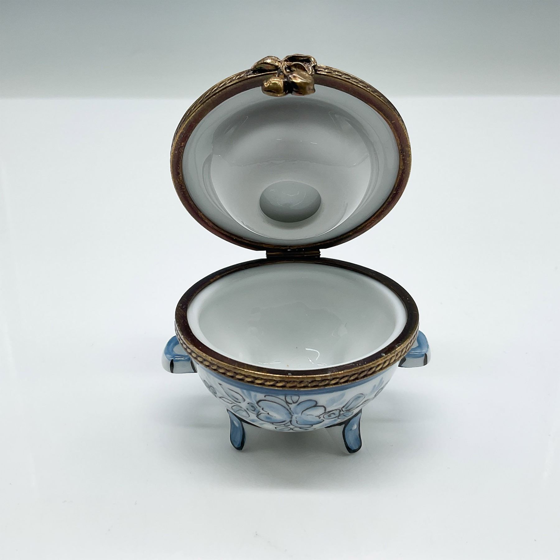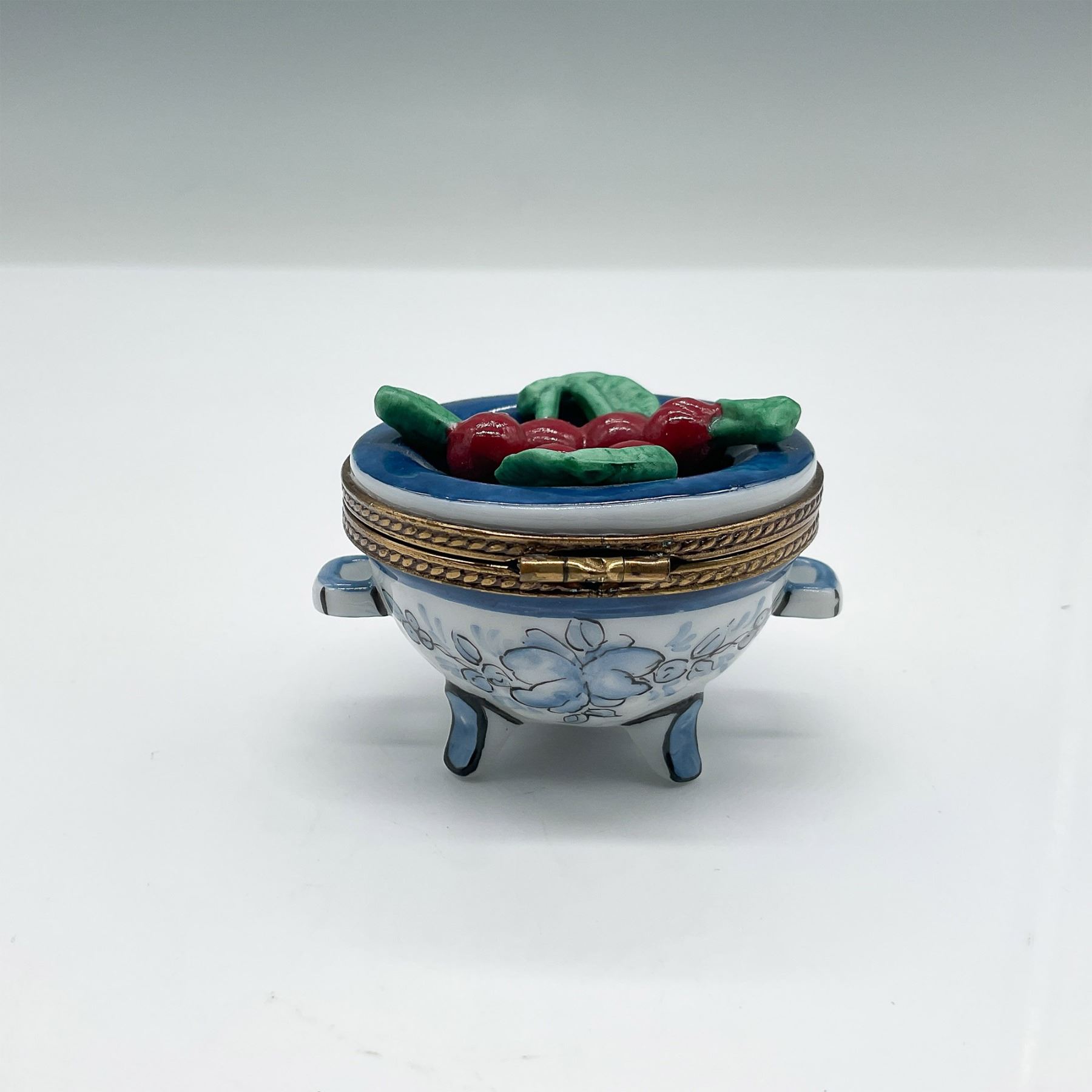 Exquisite Limoges France hand-painted porcelain trinket box in the shape of a footed bowl adorned with delicate blue floral patterns. The hinged box features a charming sculpted cherry and leaf arrangement on the lid, with an ornate brass clasp shaped like cherries. The bottom bears the Limoges France mark, along with Peint Main (hand-painted) and Limited Edition, signifying its craftsmanship and exclusivity. A beautiful collectible piece perfect for storage or display.