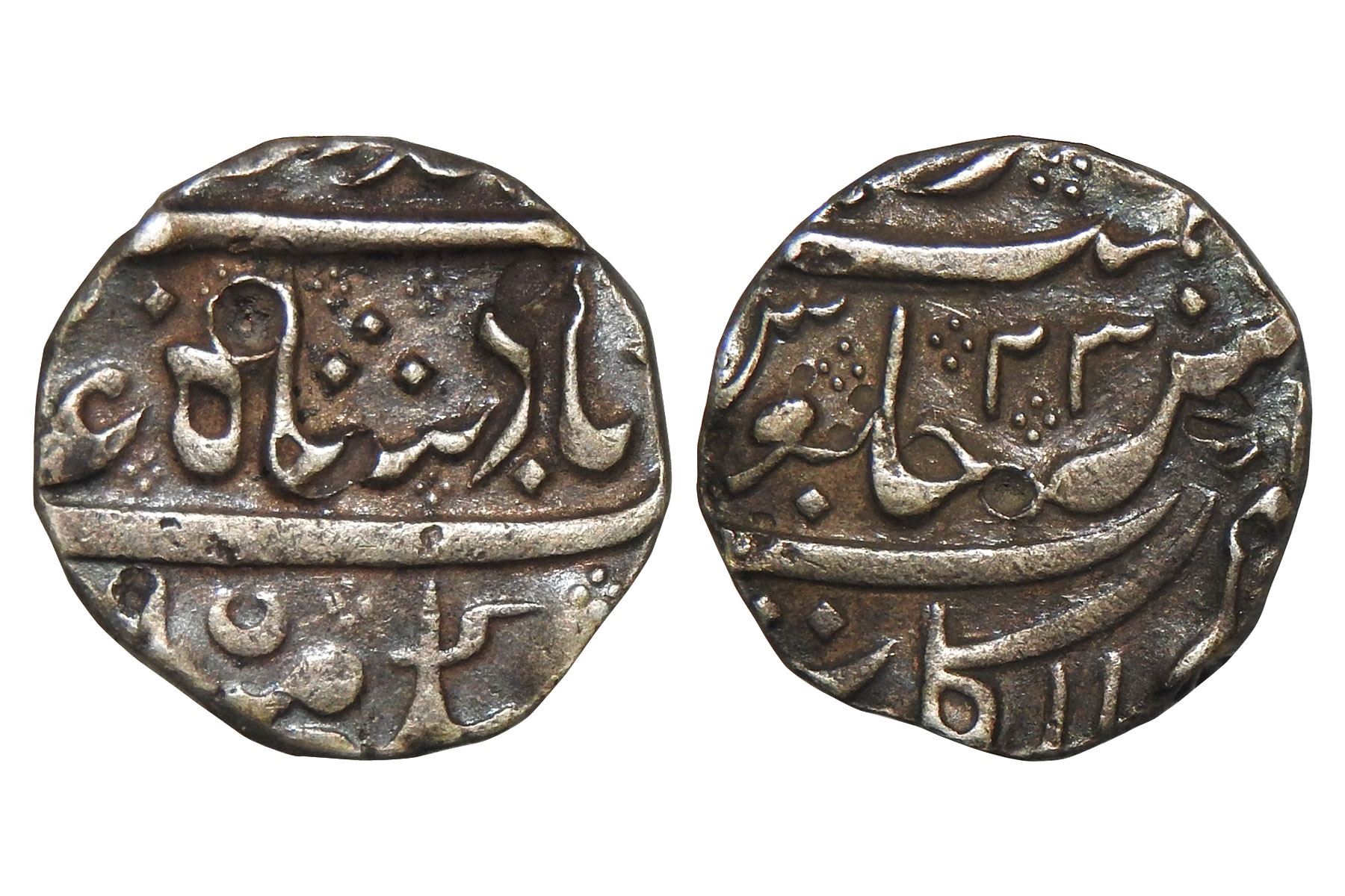 French India, Silver rupee, Alamparai mint, pseudo-mint name ‘Arkat’, in the name of Muhammad Shah, RY 23, a small crescent symbol in lowest divide on the obverse, 11.30 grams. J Brockmeyer published these rupees in JONS 194 (2008) with references quoted from the diary of Ananda Ranga Pillay. His research suggests that a French mint was located at Alamparai, North of Pondicherry where the earliest differentiable French rupees were struck, with a mark of a crescent on the obverse. A mint was subsequently opened at Pondicherry proper, which struck coins with the crescent mark on the reverse. The mint at Alamparai most likely closed soon after 1743. Very Fine, Rare.