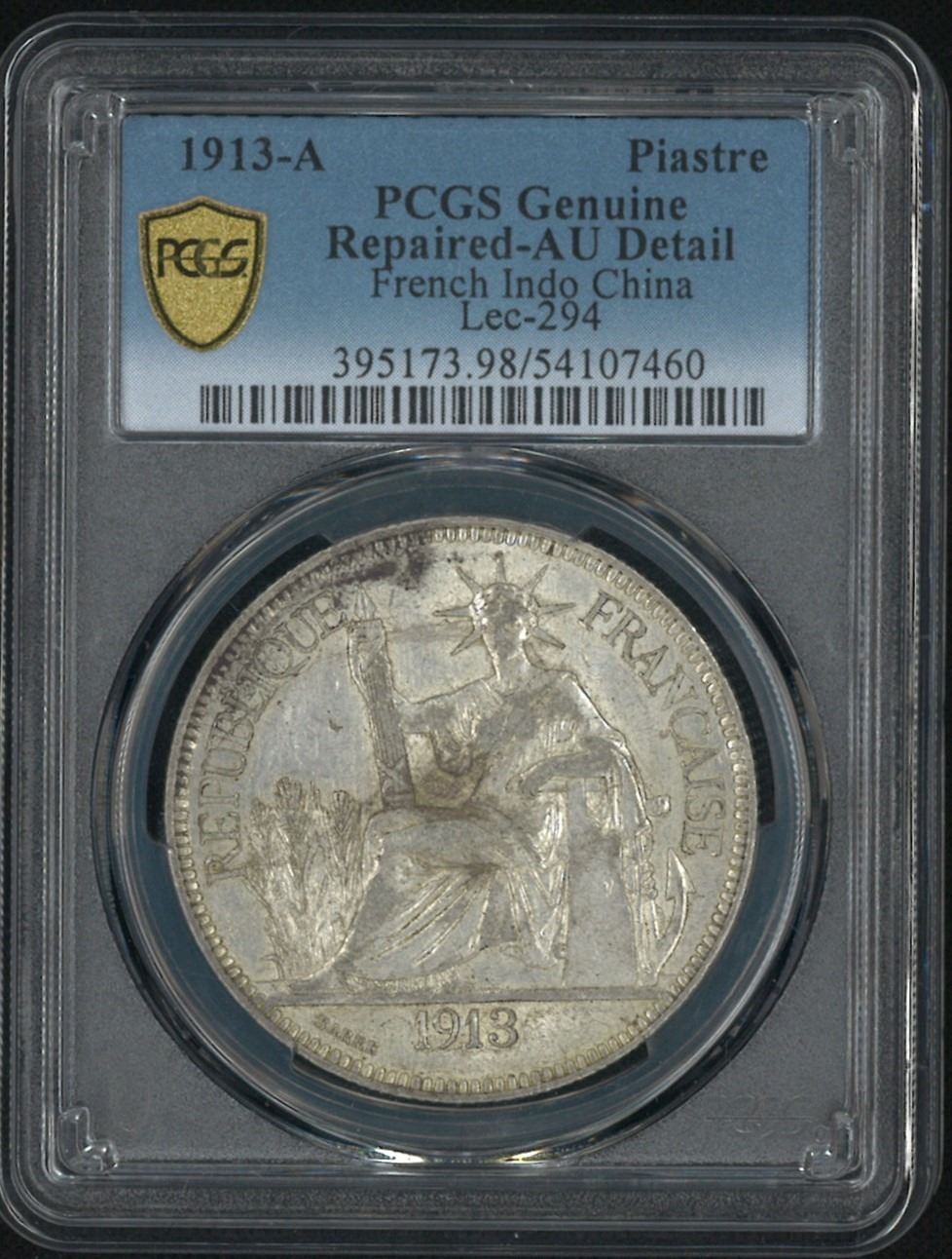 French Indo China, 1913-A, 1 Piastre silver coin. PCGS Repired -AU Detail. (54107460)