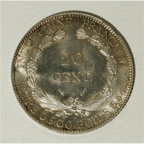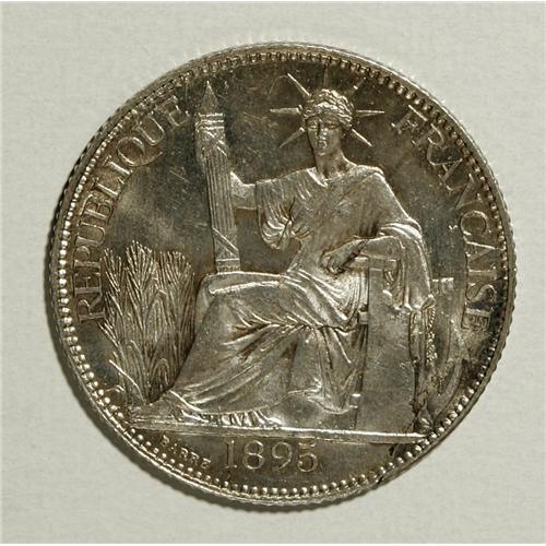 <B>French Colonial 20 Centimes 1895A, </B></I>KM3, choice lustrous UNC with light toning, one small planchet flaw at 5 o'clock on the obverse. Very scarce in this grade. Weight as 5.443.<BR><BR><b>Shipping:</b> Coins & Currency (<a target="_blank" href="http://www.heritageauctions.com/common/shipping.php">view shipping information</a>)