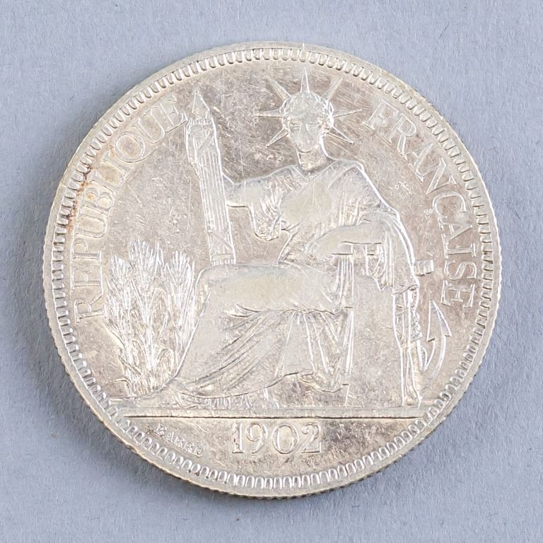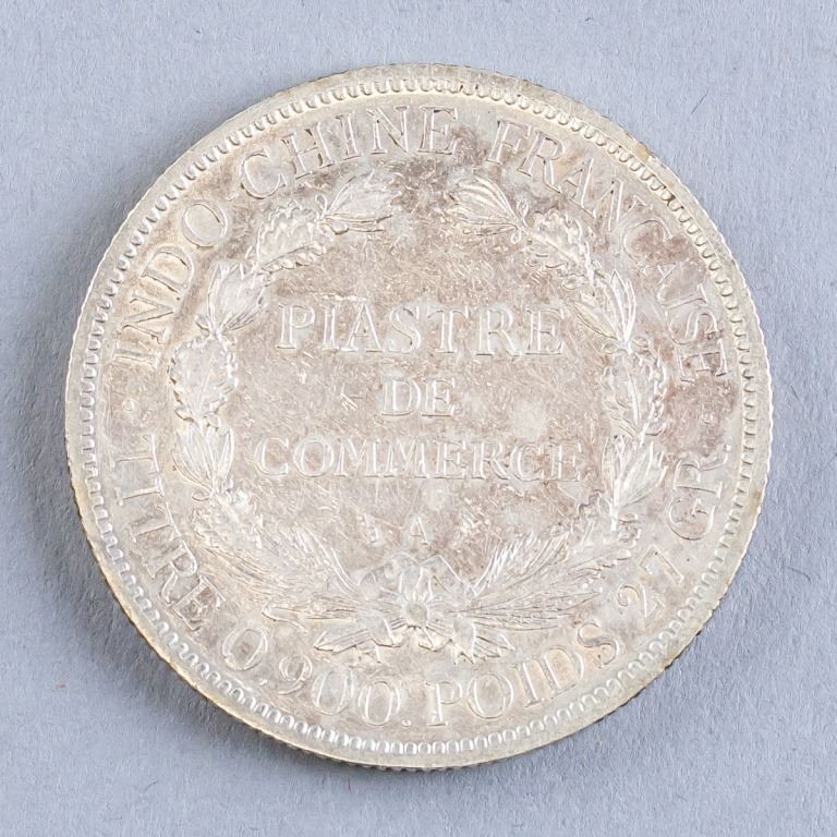 French Indochina coin. Obverse: Marianne seated left with fasces. Lettering: REPUBLIQUE FRANCAISE / 1927 / BARRE. Reverse: Denomination within wreath. Lettering: INDO-CHINE FRANCAISE / PIASTRE DE COMMERCE / A / TITRE 0,00. POIDS 27 GR.