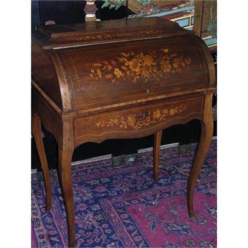 French rolltop inlayed desk. The desk has a leather writing surface with three drawers in the desk and one lower drawer.