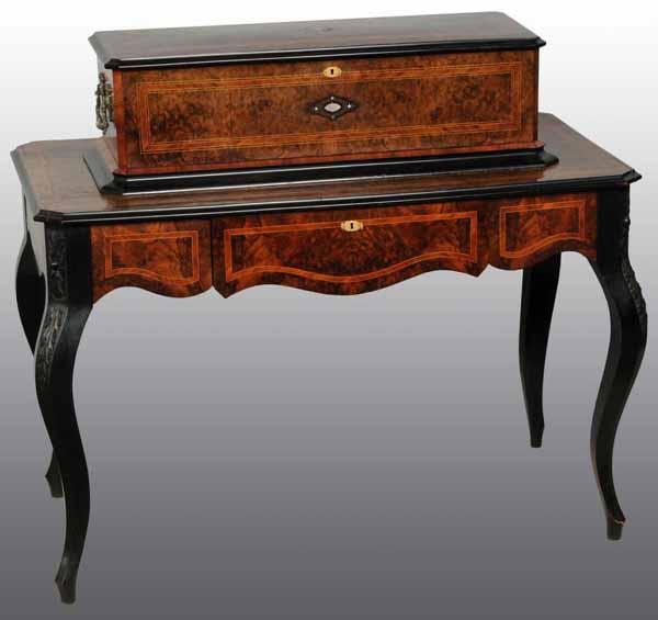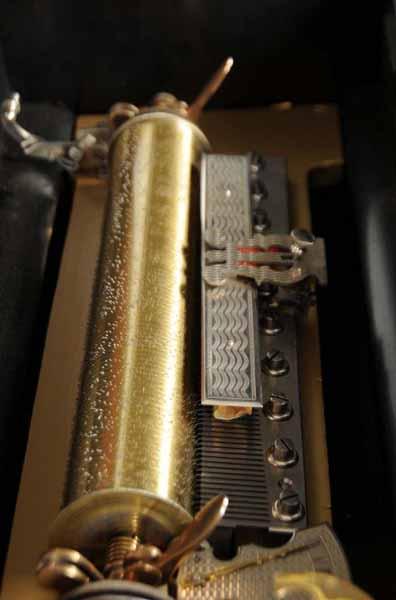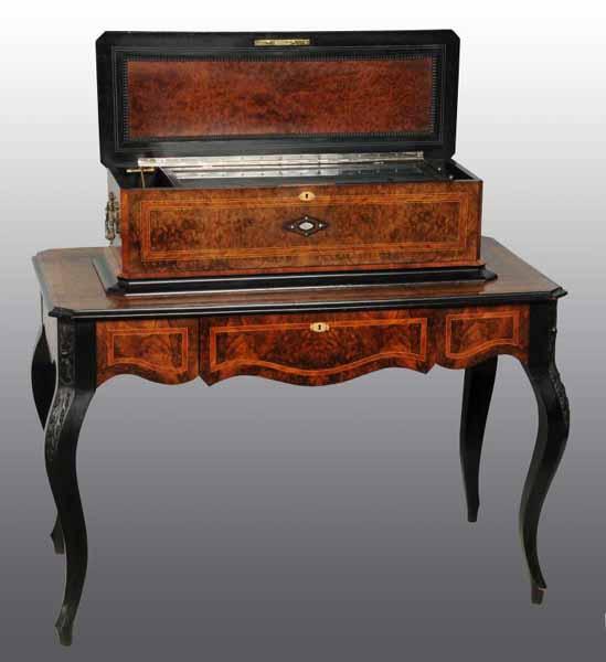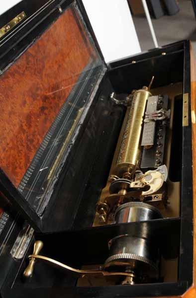 Description Interchangeable with 4 - 6 tune cylinders with base in inlaid burl walnut. Working. Condition (Excellent). Size 13" L.