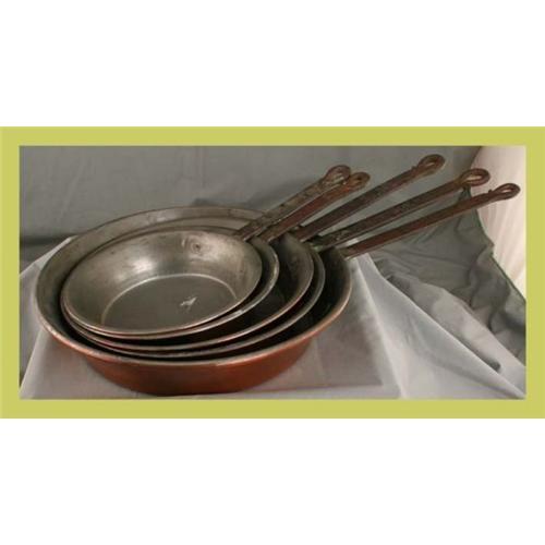 </STRONG>Title: Set of 5 1950 French Kitchenware Pans </STRONG><P>Item #: 6-164-0</P><P>Comment: This set of copper pans would look great hanging in your kitchen!</P><P>Condition: Miscellaneous dings and wear due to age and use.</P><P>Dimensions (in.): 15.5L x 8.5W x 2D; 15.75L x 9W x 2.75D; 19.25L x 10.5Wx 2.5D; 20.75L x 11W x 2.25D; 22.5L x 13W x 3D </P><P>Age (ca.): 1950</P><P>Origin: France</P><P>Style: Kitchenware</P><P>Material: Copper</P><P>Object: Pans</P><P>Piece Type: Vintage Kitchenware/Copper & Brass/Tools</P><P>Special Message: Because EuroLuxAntiques maintains its own website and lists on other online sites, while also operating a physical store location in Newberry, South Carolina, we reserve the right to end any listing early if no bids have been placed. However, once a bid has been placed, we give our online auction buyers priority and allow the listing to end as scheduled. Because of this, we encourage all of our buyers to place bids early so that your treasured find doesn't sell elsewhere to someone else. Happy bidding and thanks! Aimee & Greg Talbot at EuroLuxAntiques</P> #NTR# French Pans Kitchenware Copper