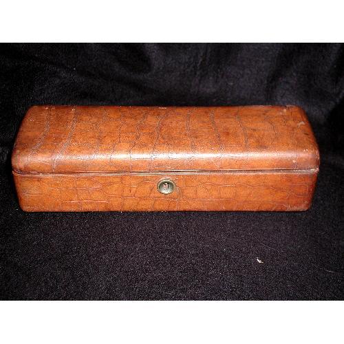 Beautifully toned brown leather box with embossed alligator skin design has a brass working lock and interior hinge. Tucked and padded deep blue fabric on the interior. In the French tradition such a box was included with the purchase of silver flatware. Used in this century for storing jewelry,gloves or mementos. Very handsome on a gentleman's desk or dresser. In excellent condition with exception to a small burn in the leather right back corner. Tag on the underside reads "Aux Trous Leathers". Measures 11.5L x 3.5W x 3H.