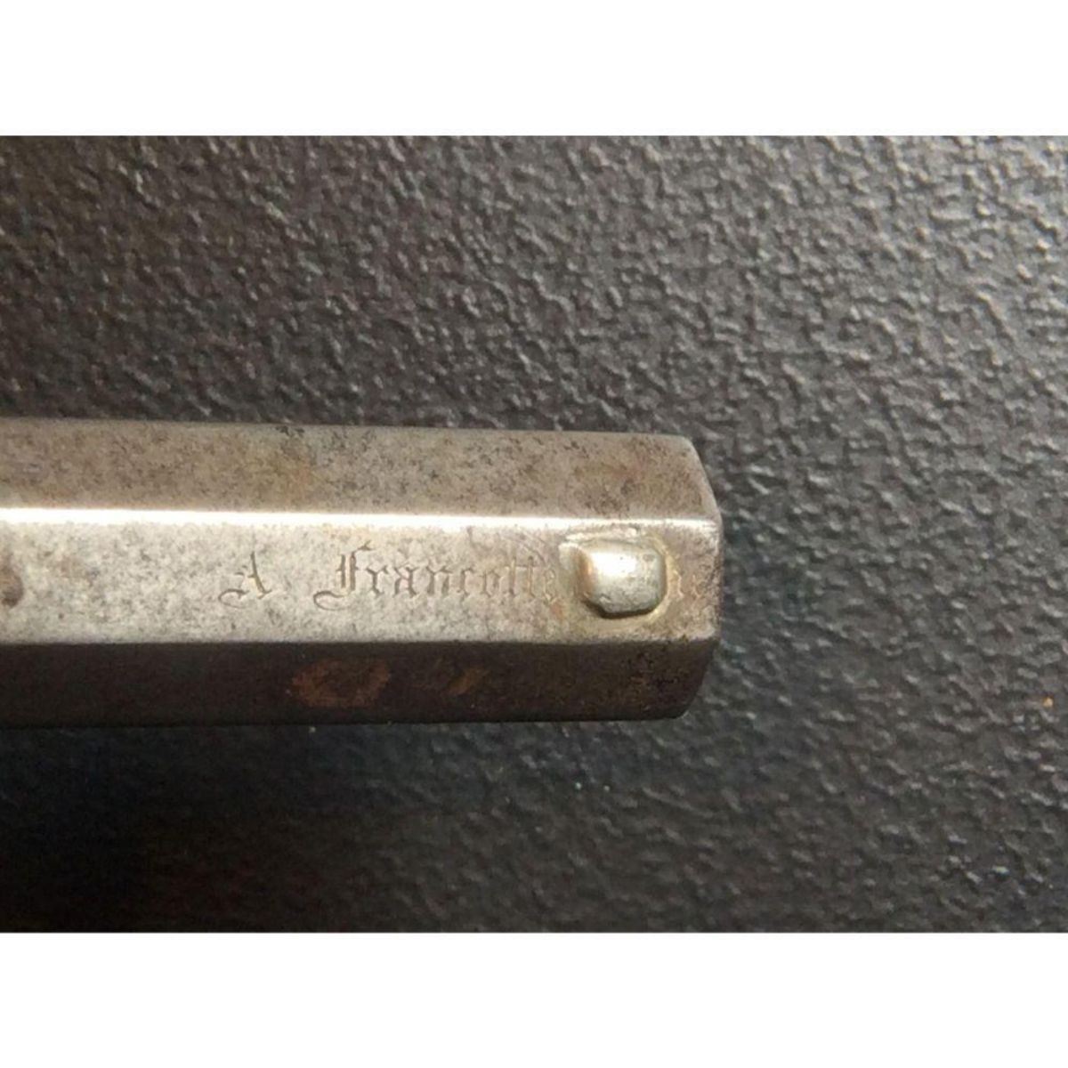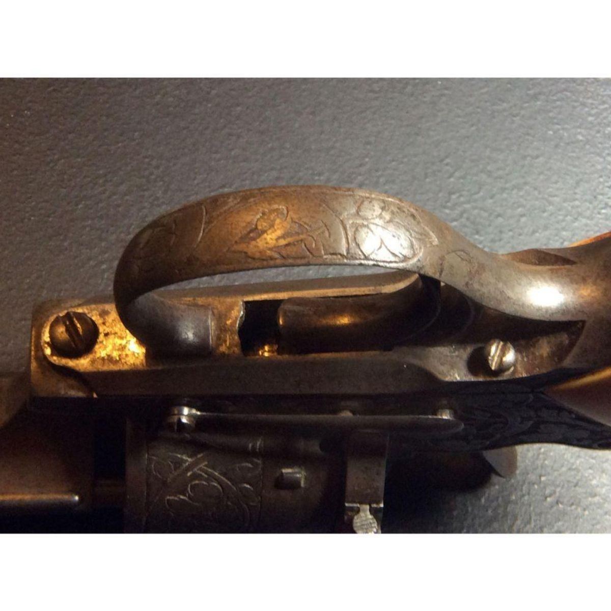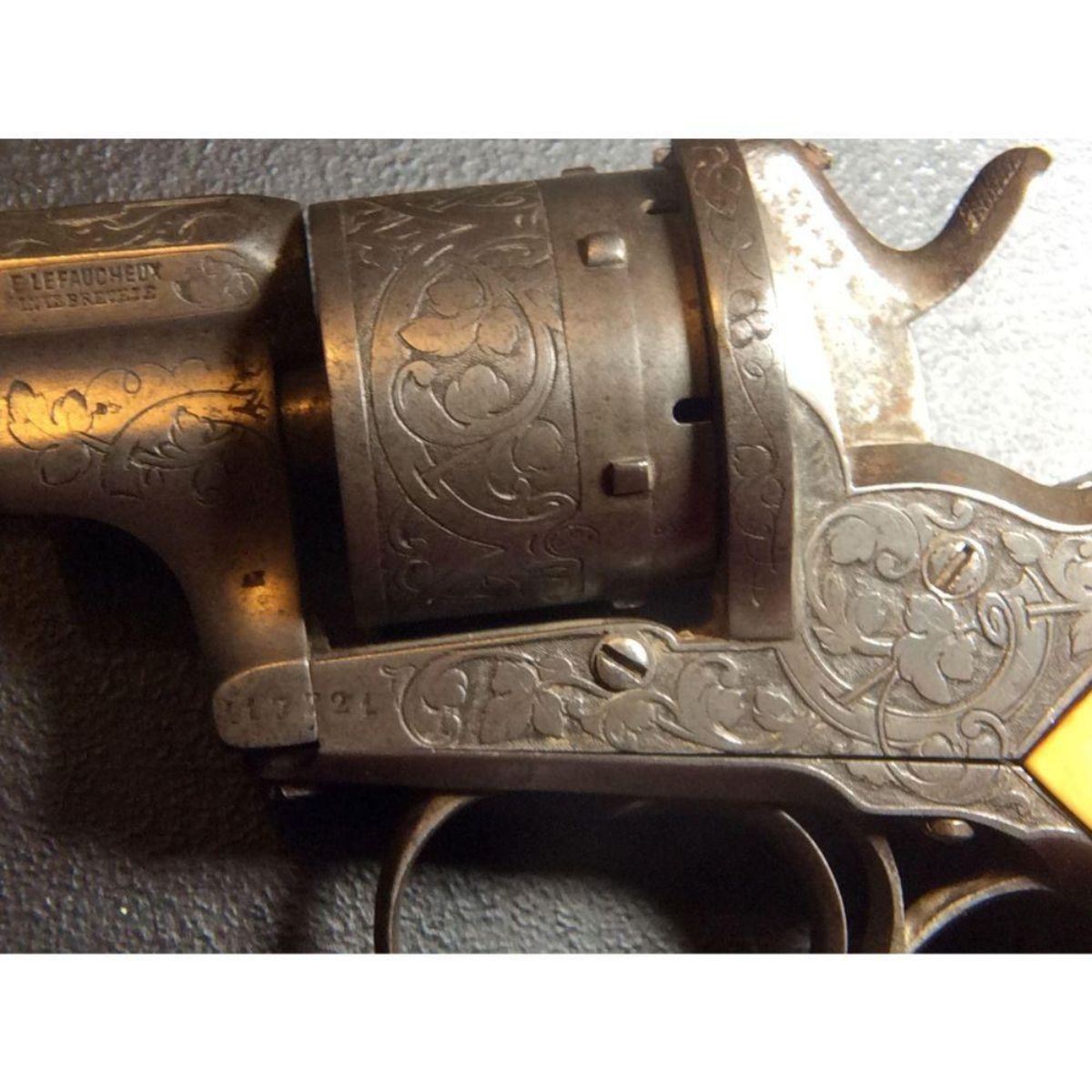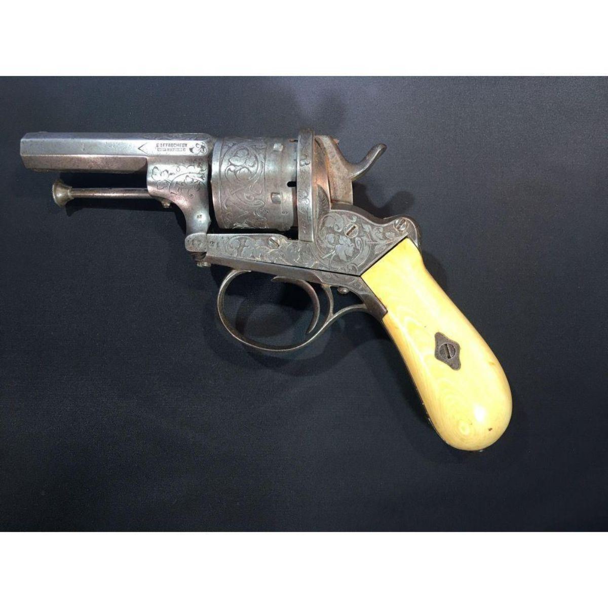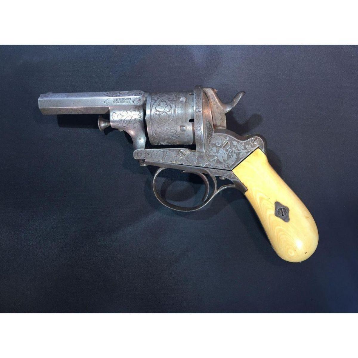 Title: French Lefaucheux Engraved 12mm Pinfire Revolver, Like Model 1858 - Antique Make: Lefaucheux Model: Pinfire Revolver (Like a Model 1858) Serial Number: 283 Year of Manufacture: circa 1860s Caliber: 12 MM Pinfire Action Type: Single Action Pinfire Revolver Markings: The right side of the frame is marked "LEOPOLD COLLETTE". The left side of the barrel is marked "E. LEFAUCHEUX / INVR BREVETE" / V proof mark and "152". There is an "ELG" in an oval on the cylinder. The majority of the metal surfaces have been nicely engraved. Barrel Length: about 6 3/8" Sights / Optics: The front sight is a dovetail set blade. The rear sight is notched hammer. Stock Configuration & Condition: The grips are smooth bone, showing much age and natural grain. The panels have shrunk over time but remain crack free and complete. The surfaces have been polished from years of handling. These were aftermarket panels. There are scattered marks throughout. The fit is very good and the grips look great on this pistol. The grips rate in about Very Good overall condition. Type of Finish: None Remains Finish Originality: None Remains Bore Condition: The bore is dark and the rifling is actually sharp and deep. There is even but mild erosion in the bore. Overall Condition: This handgun retains about 0% of its metal finish. The metal is a light brown/gray from natural age. There are many scattered areas of surface erosion. The wear and age is very natural and the engraving remains quite sharp and deep. This engraving is definitely hand cut and shows consistent age in the cuts. The screw heads are serviceable but deformed. We believe that the barrel assembly is from a different gun, but of the right model and caliber. The markings are light but generally legible. Overall, this handgun rates in about Very Good condition. Mechanics: The action functions beautifully well. We did not fire this handgun. Box, Paperwork & Accessories: None Our Assessment: This is a beautifully well-made Pinfire revolver, the likes of which even saw their way to the colonies for use in the civil war. During the American Civil War both sides fielded a wide variety of revolvers, including the M1858. The Federal forces purchased over 12,000 M1858 revolvers, primarily supplying them to cavalry forces in 1862. However, these Pinfire revolvers were replaced in service later in the war as more Colt and Remington revolvers became available and the flaws in the cartridge design became apparent. It is discussed that the discharge of Pinfire rounds in the pockets and cases of soldiers is a primary reason for their slow and only small scale adoption by our forces. CA Legal or CA Private Party Transferable: This antique handgun can be sold in California.Â