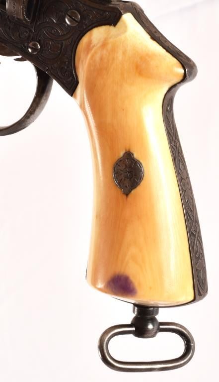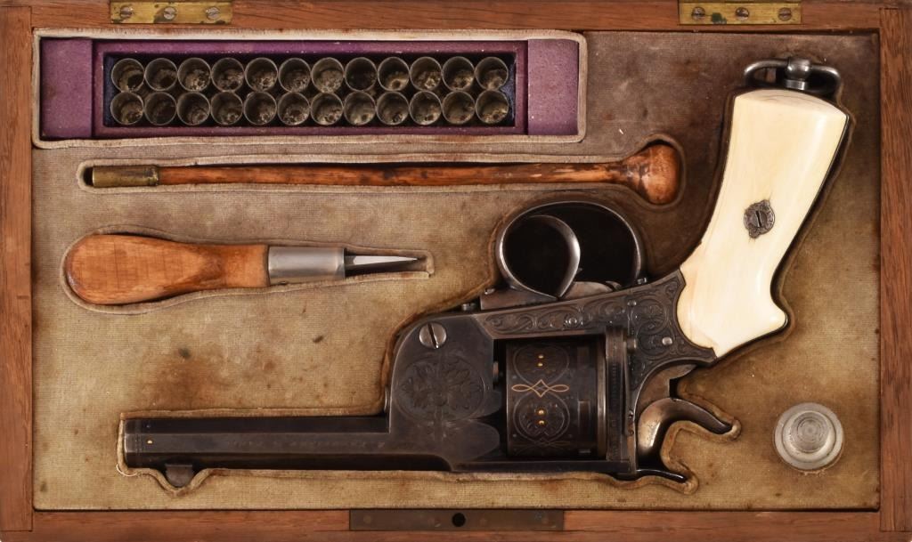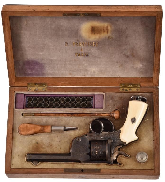 In case. Engraved with gold inlays. Makers signature on right side of barrel - 'Acier Fondu" on left side of barrel lug translates to "Cast Steel". Barrel Length 5". SN AH4898