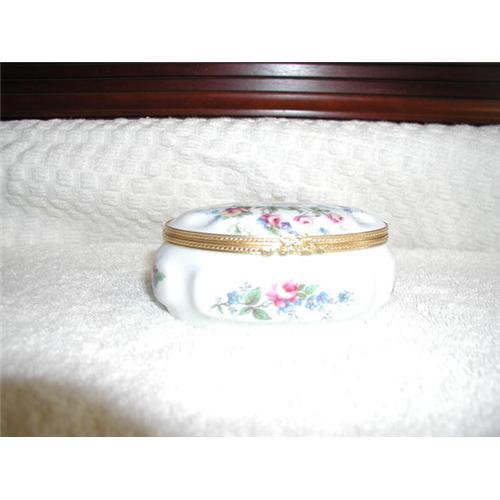 Large Limoges Box. Floral design with gold rim. Box opens to reveal spray of blue flowers on bottom and on inside of lid. Base is marked " Porcelain, Artistique, F.M. , Limoges France, Decor Main, and the emblem of the company with Limoges France stamped in blue. Beautiful collectors Item.