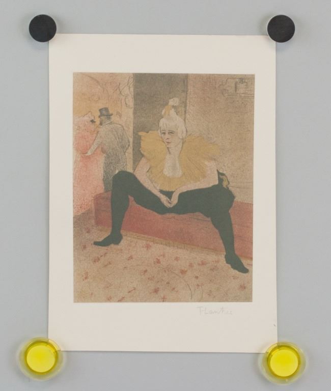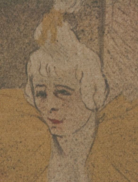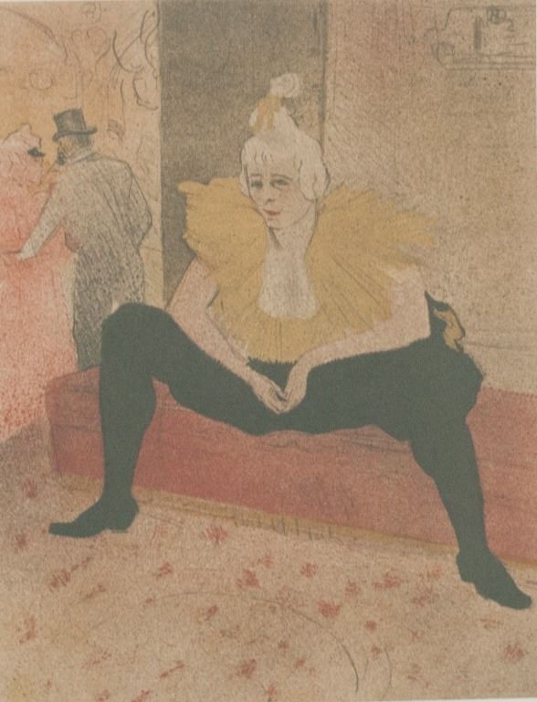 Linocut on paper. Featuring a ballet dancer sitting with their legs opened wide and their hands dangling between them. Signed "T-Lautrec" to the bottom right. Image size: 21 x 16 cm (8.3 x 6.3 inches). Sheet size: 29 x 21 cm (11.4 x 8.3 inches). Provenance: This lot carries limited provenance from a Southern Ontario estate