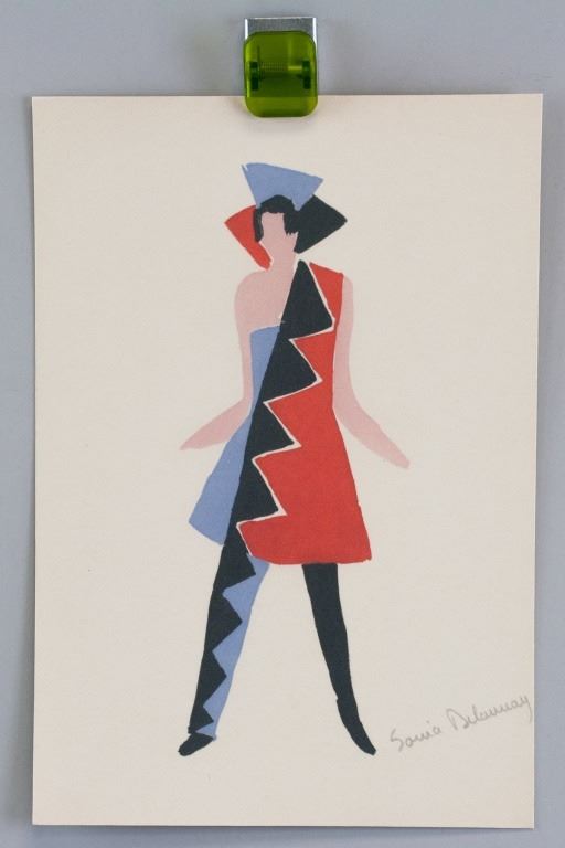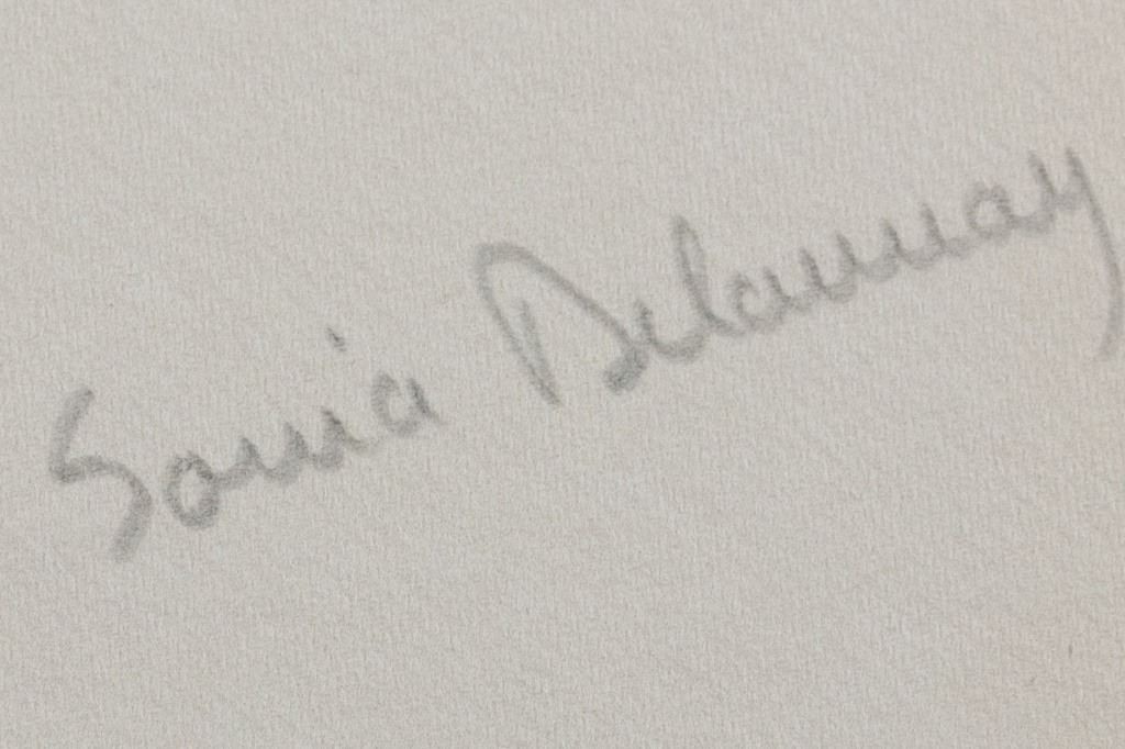 Lithograph on paper. Featuring a woman in a dress with a saw-teeth pattern. Signed "Sonia Delaunay" to the bottom right. 24.5 x 16.5 cm (9.6 x 6.5 inches). Provenance: This lot carries limited provenance from a Southern Ontario estate