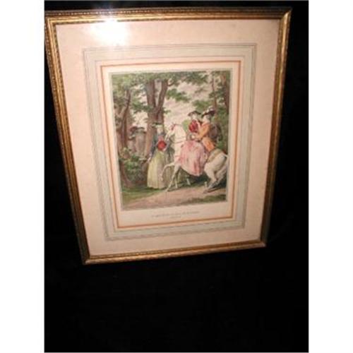 The French 19th Century lithograph hand coloring is vibrant in a wooded scene with a very young couple on horseback and mother. Dressed in the costume of the day. The antique cream mat has been French matted by hand with powder 5/8" border in soft green and lined with ruling pen in deep blue. Dark antique gold ornate wood frame. The lithograph title seen at bottom is "La Rencontre Au Bois De Boulogne" Planche VIII. The aged thin paper backing is missing in spots revealing the aged nails used to hold the glass and engraving within the frame. Excellent condition,aged cloring to mat and lithograph. Measures 19H X 16W framed.