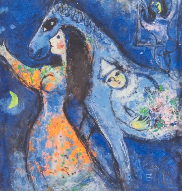 Lithograph on paper. Featuring surrealist composition of a woman with a horse. Signed "Marc Chagall" to the bottom right, with "HC" inscribed to the bottom left. 17 x 16 cm (6.7 x 6.3 inch) 30 x 21 cm (11.7 x 8.3inch).