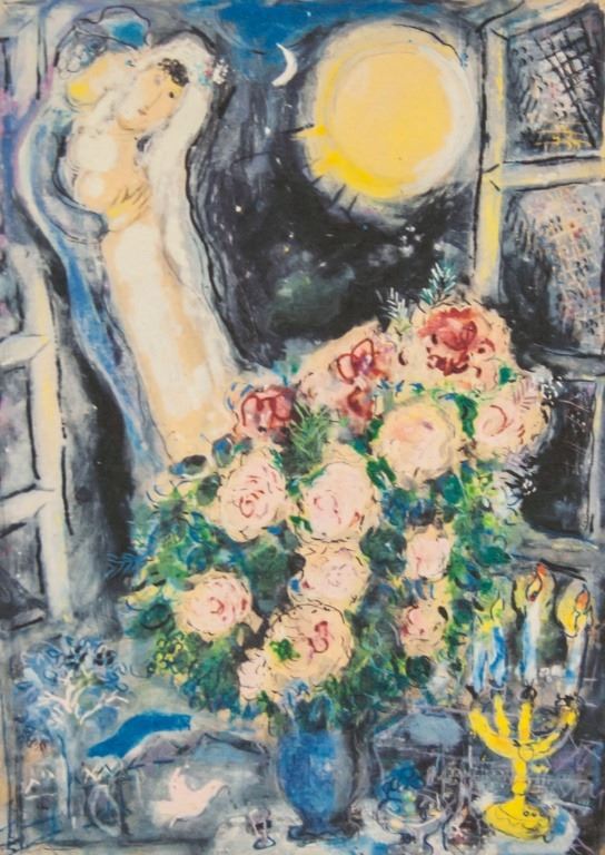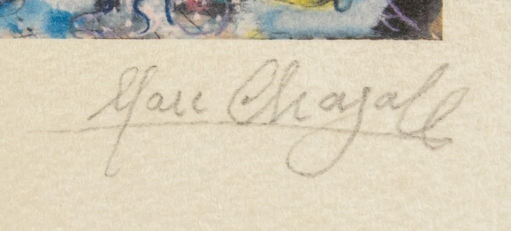 Lithograph on paper. Featuring surrealist composition of two figures hugging in front of a full moon. Signed "Marc Chagall" to the bottom right. "H.C." inscribed to the bottom left. 15.5 x 11 cm (6 x 4.3 inch) 30 x 21 cm (11.7 x 8.3 inch).