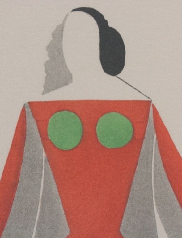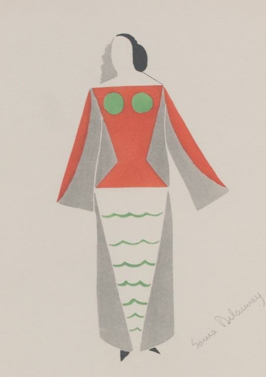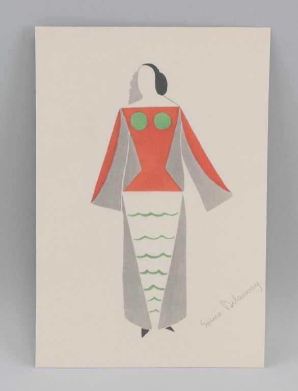 Lithograph on paper. Featuring a faceless woman wearing a red shirt and striped green skirt. Signed "Sonia Delaunay" to the bottom right corner.